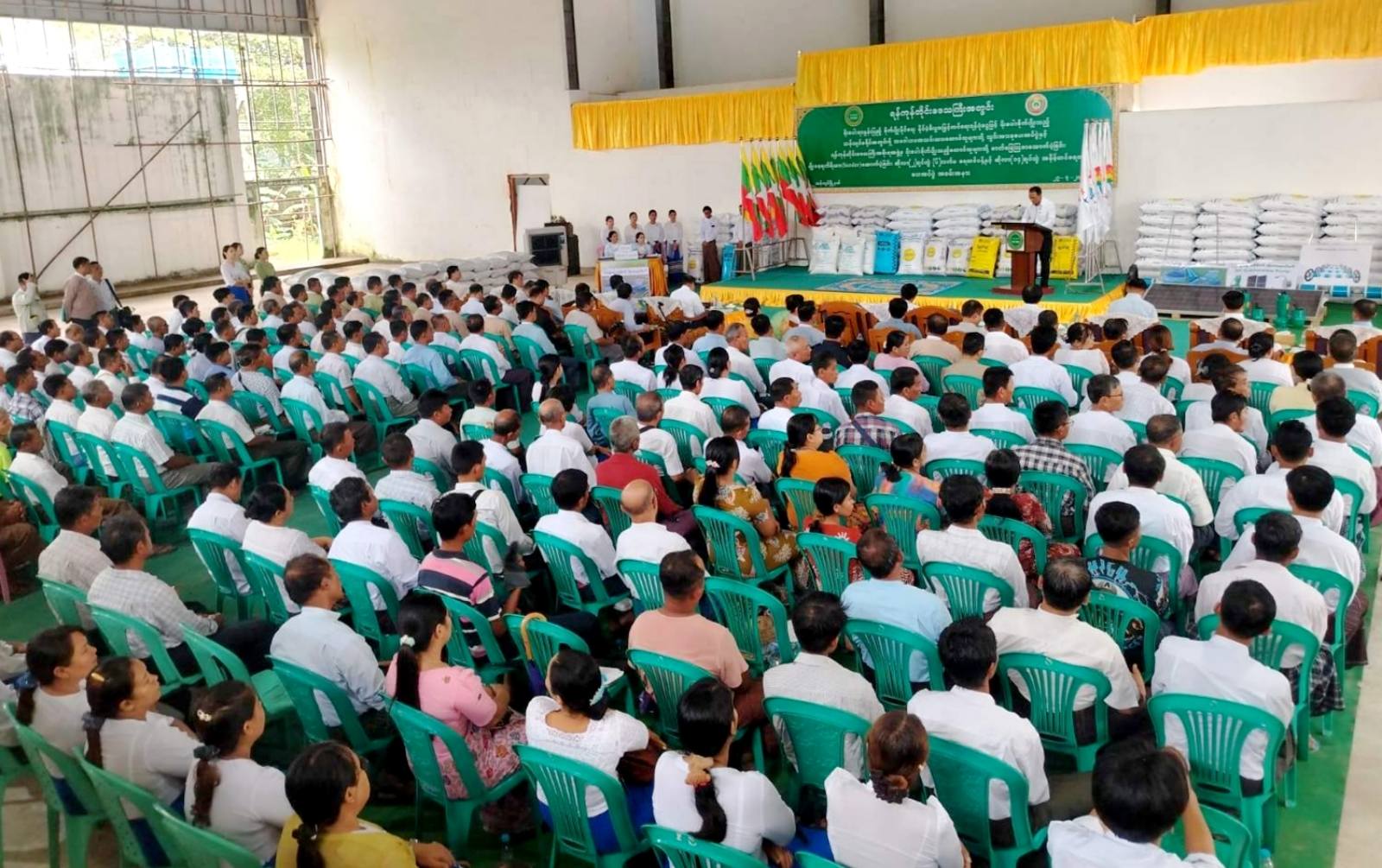 သန်လျင်ခရိုင်အတွင်း နိုင်ငံ့စီးပွားမြှင့်တင်ရေးရန်ပုံငွေဖြင့် မိုးစပါးစိုက်ပျိုးသည့် သမဝါယမအသင်းသားတောင်သူများသို့ သွင်းအားစုပေးအပ်ပွဲနှင့် တိုင်းဒေသကြီးအစိုးရအဖွဲ့မှ ဓါတ်မြေသြဇာ၊ မျိုးစေ့ချကိရိယာ Drum Seeder ဆိုလာ(၂)ချပ်တွဲ(၆)လက်မရေတင်ပန့်၊ ဆိုလာ(၁၄)ချပ်တွဲ အနိမ့်တင်ရေတင်စက်ထောက်ပံပေးအပ်ပွဲကို ယမန်နေ့ နံနက်(၁၀)နာရီတွင် သန်လျင်ခရိုင် သန်လျင်မြို့ သီဟဒီပအားကစားခန်းမ၌ ကျင်းပသည်။