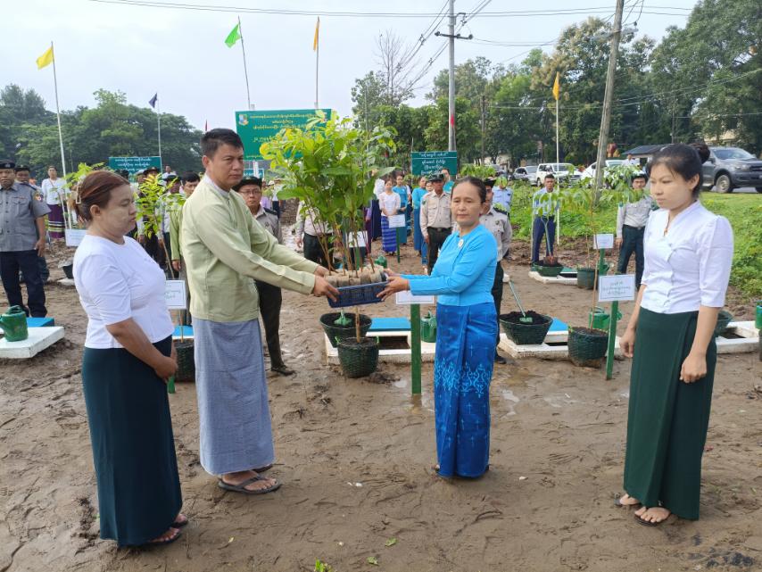 ရှေးဦးစွာ မြို့နယ်စီမံအုပ်ချုပ်ရေးအဖွဲ့ဥက္ကဋ္ဌ ဦးခင်မောင်စိုး၊ မြို့နယ်ရဲတပ်ဖွဲ့မှူး ရဲမှူးဌေးနိုင်နှင့် မြို့နယ်သစ်တောဦးစီးဌာန ဦးစီးအရာရှိ ဦးသန်းစိုးနိုင်တို့က မြို့နယ်အမျိုးသမီးရေးရာအဖွဲ့ဥက္ကဋ္ဌနှင့် တာဝန်ရှိသူများထံ စိုက်မျိုးမည့် ပျိုးပင်များအား ပေးအပ်သည်။