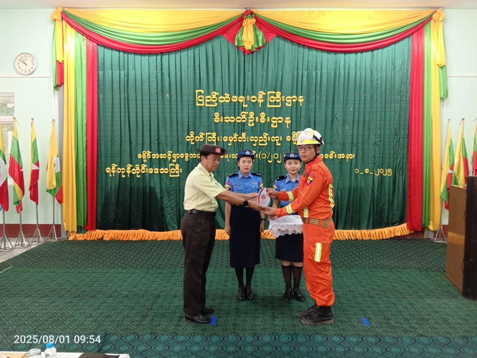 ထို့နောက် သင်တန်းတွင်ထူးချွန်ဆုရရှိသူများအား ခရိုင်စီမံအုပ်ချုပ်ရေးအဖွဲ့ဥက္ကဋ္ဌနှင့် တာဝန်ရှိသူများကဆုများအသီးသီးချီးမြှင့်ခဲ့ပြီး သင်တန်းဆင်းလက်မှတ်များကို ခရိုင်မီးသတ်ဦးစီးမှူး ဦးမြင့်ဦးကပေးအပ်ရာ သင်တန်းသားများကိုယ်စား သင်တန်းသားတစ်ဦးက လက်ခံရယူခဲ့ကြောင်း သိရသည်။
