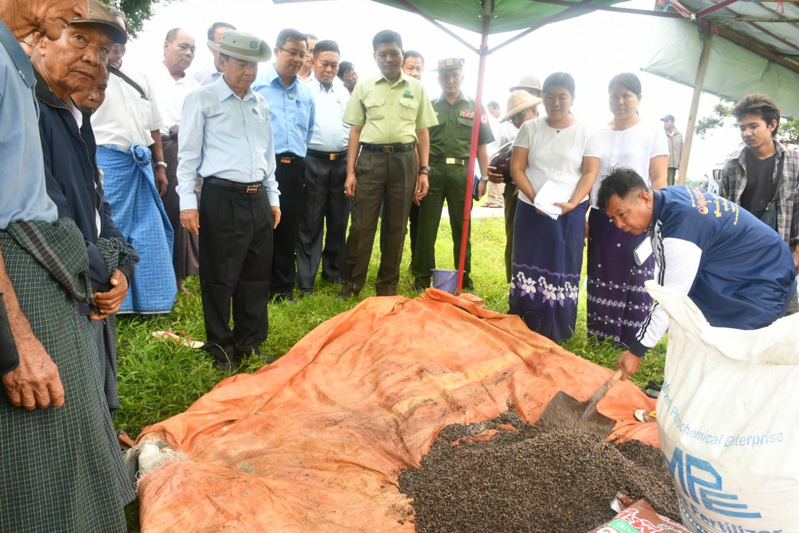 ယင်းနောက် နေပြည်တော်ကောင်စီဥက္ကဋ္ဌဦးသန်းထွန်းဦးသည် တပ်ကုန်းမြို့နယ် ရွှေမြို့ကျေးရွာသို့သွားရောက်ပြီး ကွင်းအမှတ်(၁၄၇၄)ရှိ တောင်သူဦးသန်းထိုက်၏ မိုးစပါးစိုက်ခင်းတွင် သဘာဝမြေဩဇာနှင့်ဓာတ်မြေဩဇာပေါင်းစပ်ထည့်သွင်းခြင်း ကွင်းသရုပ်ပြပွဲကိုတက်ရောက်၍ တောင်သူများနှင့်တွေ့ဆုံကာ နေပြည်တော်ကောင်စီဥက္ကဋ္ဌဦးသန်းထွန်းဦးက မျိုး၊ မြေ၊ ရေ၊ နည်း နည်းလမ်းများနှင့်အညီ စနစ်တကျစိုက်ပျိုးဆောင်ရွက်ရေး၊ မိုး၊ ဆောင်း၊ နွေ ရာသီပြည့်သီးနှံစိုက်ပျိုးနိုင်ရေး၊ သီးနှံများပန်းတိုင်အထွက်နှုန်းရရှိရေးနှင့် သဘာဝမြေဩဇာအား တောင်သူများကိုယ်တိုင်ပြုလုပ်သုံးစွဲရေး၊ ကြဲပက်စနစ်ပပျောက်အောင် မျိုးစေ့ချကိရိယာများ၊ ကောက်စိုက်စက်များဖြင့်စိုက်ပျိုးနိုင်ရေး၊ စိုက်ပျိုးရေရရှိရေးအတွက် နည်းလမ်းမျိုးစုံဖြင့်အသုံးပြုဆောင်ရွက်ရေးနှင့် ဓာတ်မြေဩဇာများကိုနိုင်ငံတော်မှ သက်သာသောဈေးနှုန်းဖြင့်ဖြန့်ဝေပေးမည့်အစီစဉ်များကိုပြောကြားခဲ့သည်။ ထို့နောက် နေပြည်တော်ကောင်စီဥက္ကဋ္ဌက ယူရီးယားဓာတ်မြေဩဇာကိုလည်းကောင်း၊ နေပြည်တော်ကောင်စီဝင်များက အောင်နိုင်တိုးမျိုးစပါးများ၊ နေကြာနှင့်ပဲတီစိမ်းမျိုးများ၊ သွင်းအားစုများကိုလည်းကောင်း တောင်သူများထံပေးအပ်ကြသည်။ ယင်းနောက်မိုးစပါးစိုက်ခင်းအား သဘာဝမြေဩဇာနှင့်ဓာတ်မြေဩဇာပေါင်းစပ်ထည့်သွင်းခြင်းဆောင်ရွက်နေမှုအား ကြည့်ရှုအားပေးခဲ့ ကြောင်း သိရသည်။