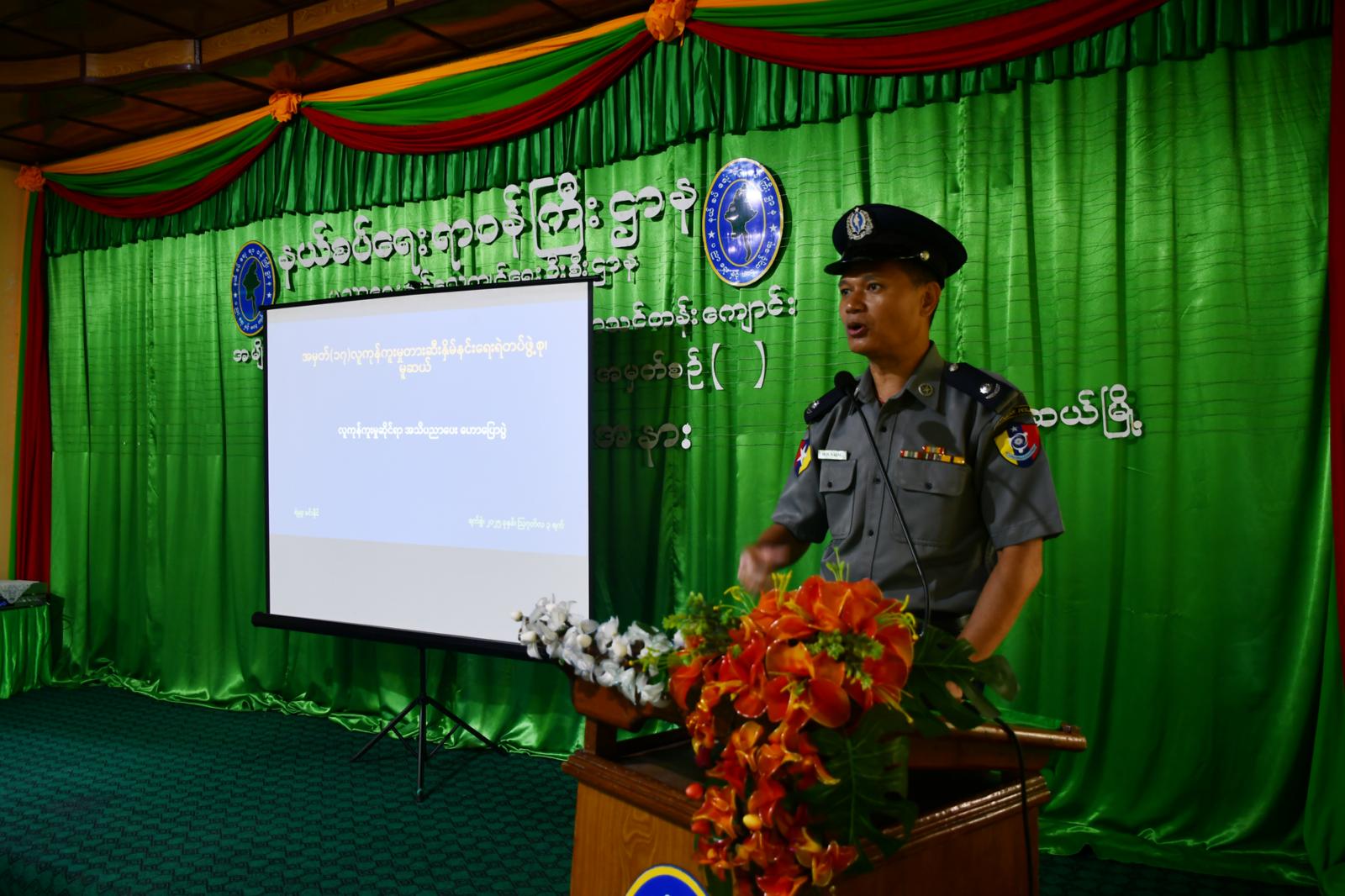 ထိုသို့ဆောင်ရွက်ရာတွင် လူကုန်ကူးမှုတားဆီးနှိမ်နင်းရေးတပ်ဖွဲ့စုမှူး ရဲမှူးမင်းနိုင်က လူကုန်ကူးခံရမှုများ၊ ပြစ်မှုပြစ်ဒဏ်များအကြောင်းနှင့် လူကုန်ကူးနေသည်ဟု သံသယရှိပါက ဆက်သွယ်ရမည့် လိပ်စာဖုန်းနံပါတ်များကို ဟောပြောခဲ့ပြီး လက်ကမ်းစာစောင်များ ဖြန့်ဝေပေးခဲ့ပါသည်။ ဆက်လက်၍ ပြန်ကြားရေးနှင့်ပြည်သူ့ဆက်ဆံရေးဦးစီးဌာနမှ လက်ထောက်ညွှန်ကြားရေးမှူး ဒေါ်ကေသွယ်ဟန်က ဆက်သွယ်ရေးလိမ်လည်မှုတိုက်ဖျက်ရေးဆိုင်ရာ အကြောင်း ဟောပြောပြီး လန်ချန်း-မဲခေါင်တရားဥပဒေစိုးမိုးရေးနှင့် လုံခြုံရေး ပူးပေါင်းဆောင်ရွက်မှုဗဟိုဌာနမှ ပေးပို့လာသည့် အသိပညာပေးဗီဒီယိုကလစ် (၂)ခုအား ပြသပေးခဲ့သည်။