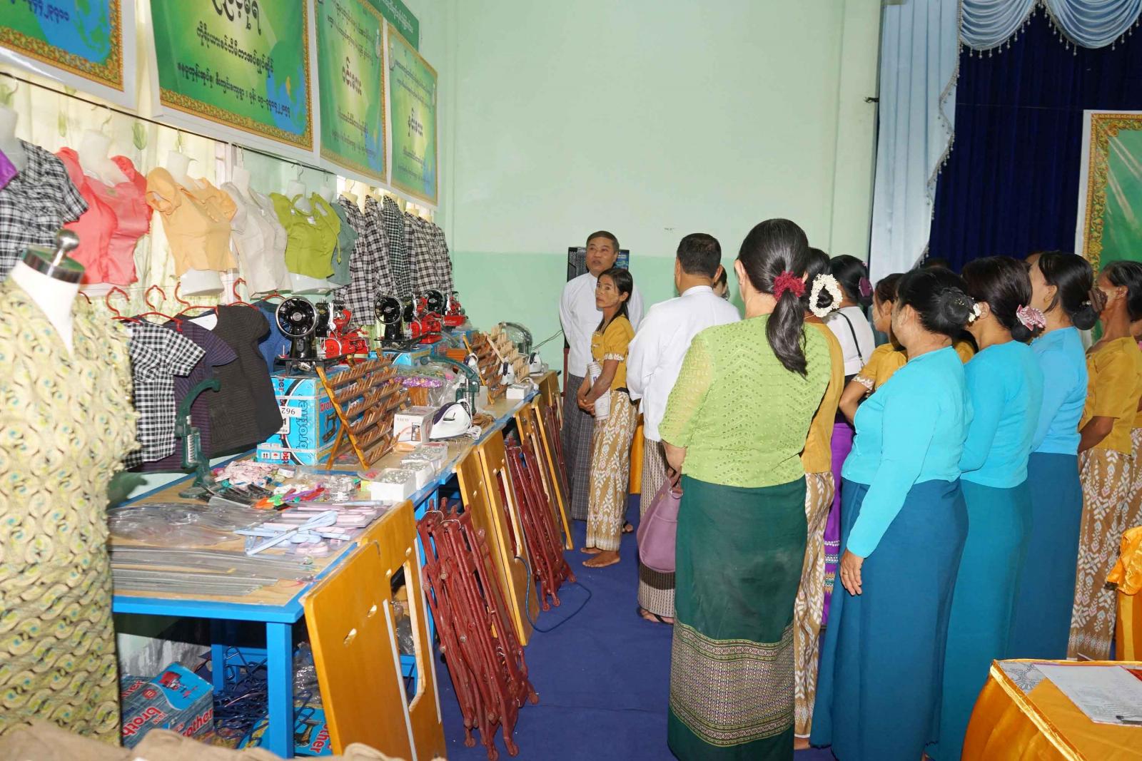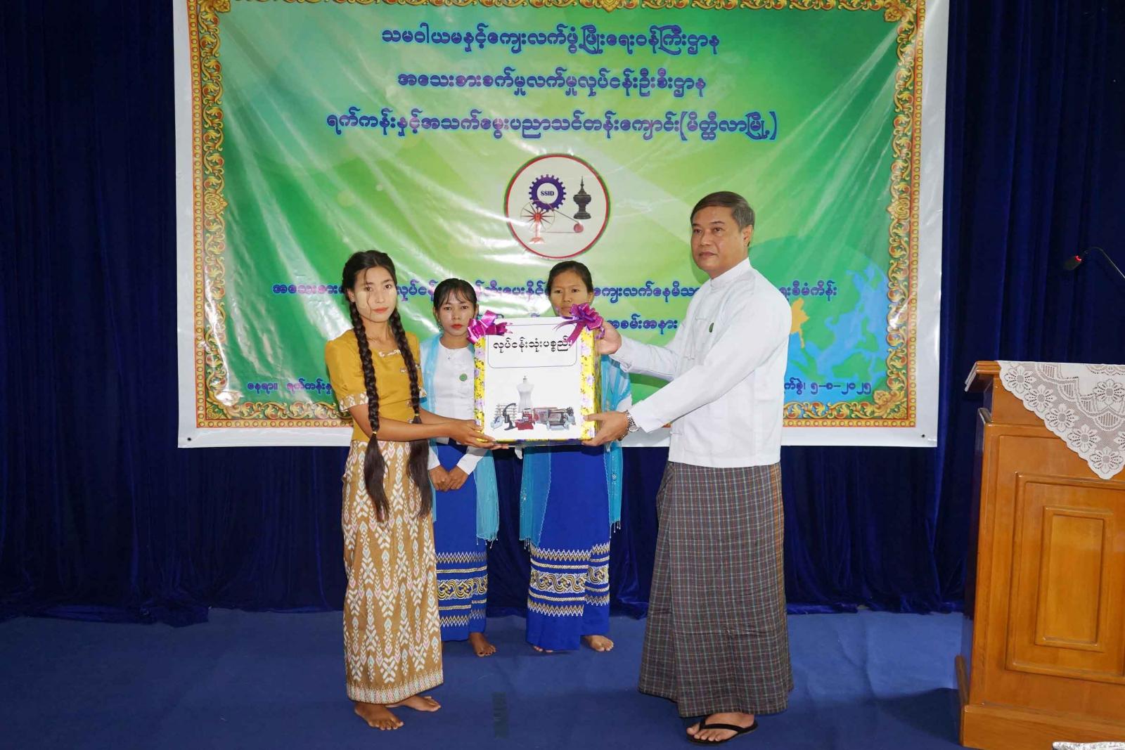 အသေးစားကုန်ထုတ်လုပ်ငန်းများ ဖန်းတီးနိုင်ရေးနှင့် ကျေးလက်နေမိသားစု ဝင်ငွေတိုးရေးစီမံကိန်းလုပ်ငန်းသုံးပစ္စည်းများ ပေးအပ်ပွဲအခမ်းအနားတွင် မန္တလေးတိုင်းဒေသကြီး၊ အသေးစားစက်မှုလက်မှုလုပ်ငန်းဦးစီးဌာန တိုင်းဒေသကြီးဦးစီးမှူး ဦးဝင်းဗိုလ်နှင့် မိတ္ထီလာခရိုင်စီမံခန့်ခွဲရေးနှင့်အုပ်ချုပ်ရေးကော်မတီမှအဖွဲ့ဝင် ဦးကျော်ဇေယျာတို့က အဖွင့်အမှာစကားပြောကြားခဲ့ပြီး တိုင်းဒေသကြီးဦးစီးမှူးနှင့် တာဝန်ရှိသူများက စက်ချုပ်နည်းပညာသင်တန်းမှ ထူးချွန်သင်တန်းသူ (၅)ဦးအား လုပ်ငန်းသုံးပစ္စည်းနှင့် ဆုများအသီးသီးပေးအပ်ခဲ့သည်။ ၎င်းနောက်ရက်ကန်းနှင့် အသက်မွေးပညာသင်တန်းကျောင်း(မိတ္ထီလာ)မှ ကျောင်းအုပ်ဆရာမကြီးဒေါ်ဖြူဖြူမြင့်က သင်တန်းသူများအား သင်တန်းဆင်းလက်မှတ်များ ပေးအပ်ခဲ့ရာ သင်တန်းသူတစ်ဦးက ကျေးဇူးတင်စကားပြန်လည်ပြောကြားခဲ့သည်။ ယင်းနောက် တိုင်းဒေသကြီးဦးစီးမှူးနှင့်တာဝန်ရှိသူများက သင်တန်းသူများနှင့်အတူ အမှတ်တရာစုပေါင်းမှတ်ဓာတ်ပုံများရိုက်ကူးခဲ့ကြပြီး သင်တန်းသူများချူပ်ထားသည့် အဝတ်အထည်များအား လိုက်လံကြည့်ရှုအားပေးခဲ့သည်။