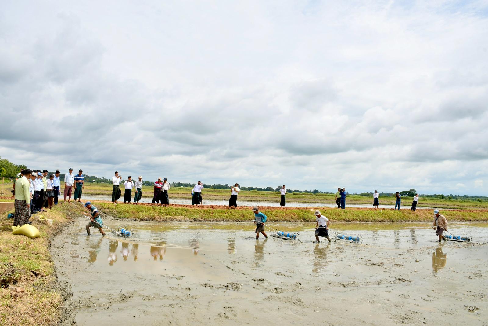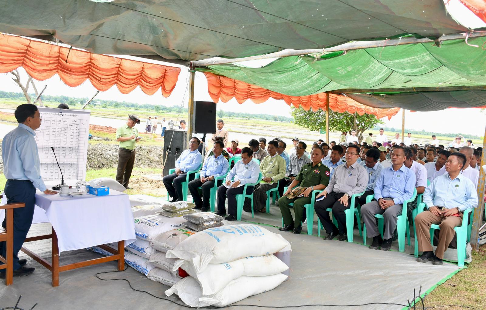 ယင်းနောက် နေပြည်တော်ကောင်စီဥက္ကဋ္ဌ ဦးသန်းထွန်းဦးမှ လက်ဆွဲမျိုးစေ့ချကိရိယာများနှင့် နေကြာ၊ ပဲတီစိမ်းမျိုးများအားလည်းကောင်း၊ နေပြည်တော်ကောင်စီဝင်များမှ အောင်နိုင်တိုးမျိုးစပါးများနှင့် သွင်းအားစုများကိုလည်းကောင်း တောင်သူများထံပေးအပ်ကြပြီး လက်ဆွဲမျိုးစေ့ချကိရိယာဖြင့် မိုးစပါးစိုက်ပျိုးနေမှုကို ကြည့်ရှုအားပေးခဲ့ကြသည်။