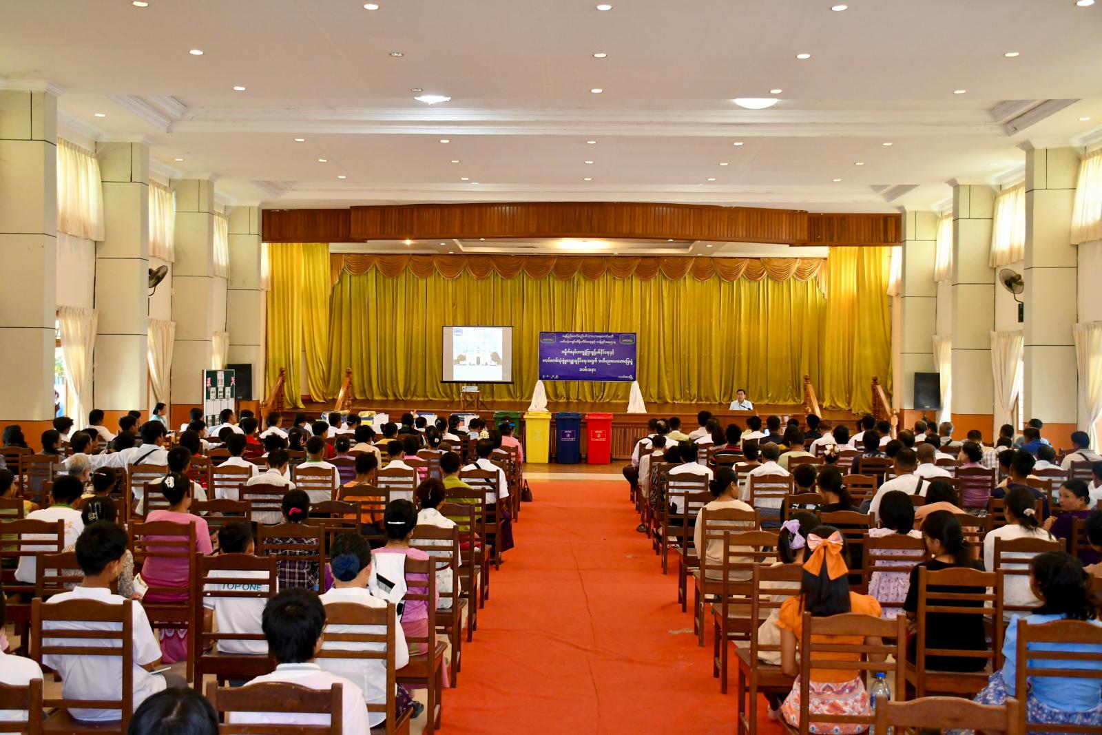ဆက်လက်၍ နေပြည်တော်ကောင်စီဥက္ကဋ္ဌ ဦးသန်းထွန်းဦးသည် လယ်ဝေးမြို့ သီရိမင်္ဂလာခန်းမ၌ ကျင်းပပြုလုပ်သည့် အမှိုက်စနစ်တကျ ခွဲခြားစွန့်ပစ်နိုင်ရေးနှင့် ပလပ်စတစ်သုံးစွဲမှုလျှော့ချနိုင်ရေးအတွက် အသိပညာပေးဟောပြောပွဲအခမ်းအနားကို တက်ရောက်သည်။