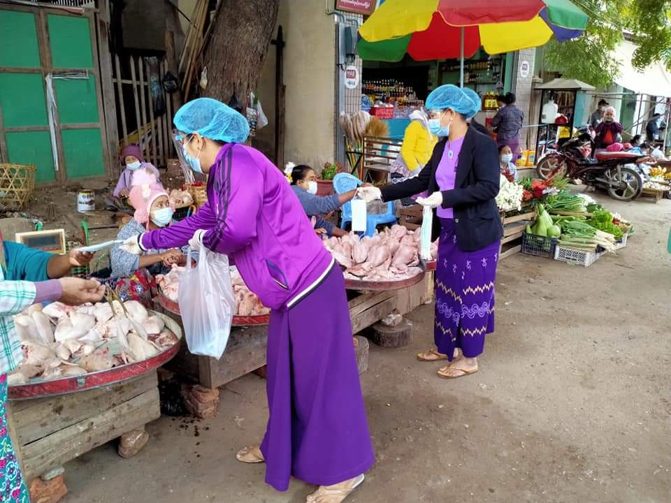 ညောင်ဦးမြို့နယ် ကျန်းမာရေးရေးဦးစီးဌာနနှင့်ညောင်ဦးမြို့နယ် မိခင်နှင့်ကလေးစောင့်ရှောက်ရေးအသင်း ဥက္ကဋ္ဌ ဒေါ်ထားထားလွင် ဦးဆောင်သောအဖွဲ့ဝင်များသည် မဏိစည်သူဈေးနှင့်ဘုန်းစဉ် အခွန်လွတ်ဈေးအတွင်း အပြင်၊ ဈေးရောင်းဈေးဝယ်များနှင့် လမ်းသွားလမ်းလာများ လူတိုင်း နှာခေါင်းစည်း Mask တပ်ဆင်သွားလာစေရေး၊ နှာခေါင်း စည်းတပ်ဆင်ရာတွင် စနစ်တကျတပ်ဆင်ကြရန်၊ အသုံးပြုပြီးသော နှာခေါင်းစည်းများကို စနစ်တကျ စွန့်ပစ်ကြရန် လက်ကိုင်စပီကာဖြင့်ပညာပေးဆော်ဩခြင်းများဆောင်ရွက်ခဲ့ကြောင်းသိရကာ နှာခေါင်းစည်း Mask အခု ၁၀၀၀နှင့် Face Shield အခု ၅၀တို့ကို ဖြန့်ဝေပေးခဲ့ကြောင်းသိရသည်။