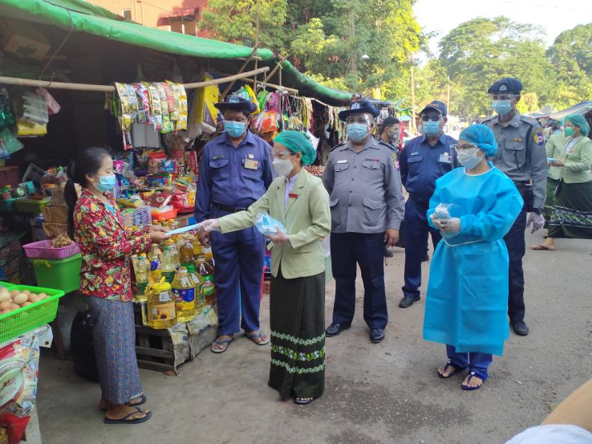 ထိုသို့ဆောင်ရွက်ရာတွင်မြို့နယ် အထွေထွေအုပ်ချုပ်ရေးဦးစီးဌာနမှတာဝနိရှိသူများ၊ မြို့နယ်ရဲတပ်ဖွဲ့၊ မြို့နယ် ပြည်သူ့ ကျန်းမာရေးဦးစီးဌာမှတာဝန်ရှိသူများ၊ မြို့နယ်စည်ပင်သာယာရေး တာဝန်ရှိသူနှင့်ဝန်ထမ်းများ မြို့နယ် ပြန်ကြားရေးနှင့် ပြည်သူ့ဆက်ဆံရေးဦးစီးဌာန၊ ရပ်ကွက်အုပ်ချုပ်ရေးမှူးတို့ စုပေါင်း၍လက်ရှိဖြစ်ပွား နေသည့် ကိုဗစ်-၁၉ရောဂါ ကာကွယ်ထိန်းချုပ်ခြင်း အနေဖြင့်ပြည်သူများတစ်ဦးမှ တစ်ဦးသို့ရောဂါ ကူးစက်ပြန့်ပွားမှု မရှိစေရန်နှာ ခေါင်းစည်း(Mask)စနစ်တကျ တပ်ဆင်ကြရေး အသိပညာပေးလက်ကမ်း စာစောင်များ ဖြန့်ဝေ ပေးခြင်း အပြင်နှာခေါင်းစည်း Mask နှင့် Face shield တို့အား အခမဲ့ဖြန့်ဝေပေးကြောင်းသိရသည်။