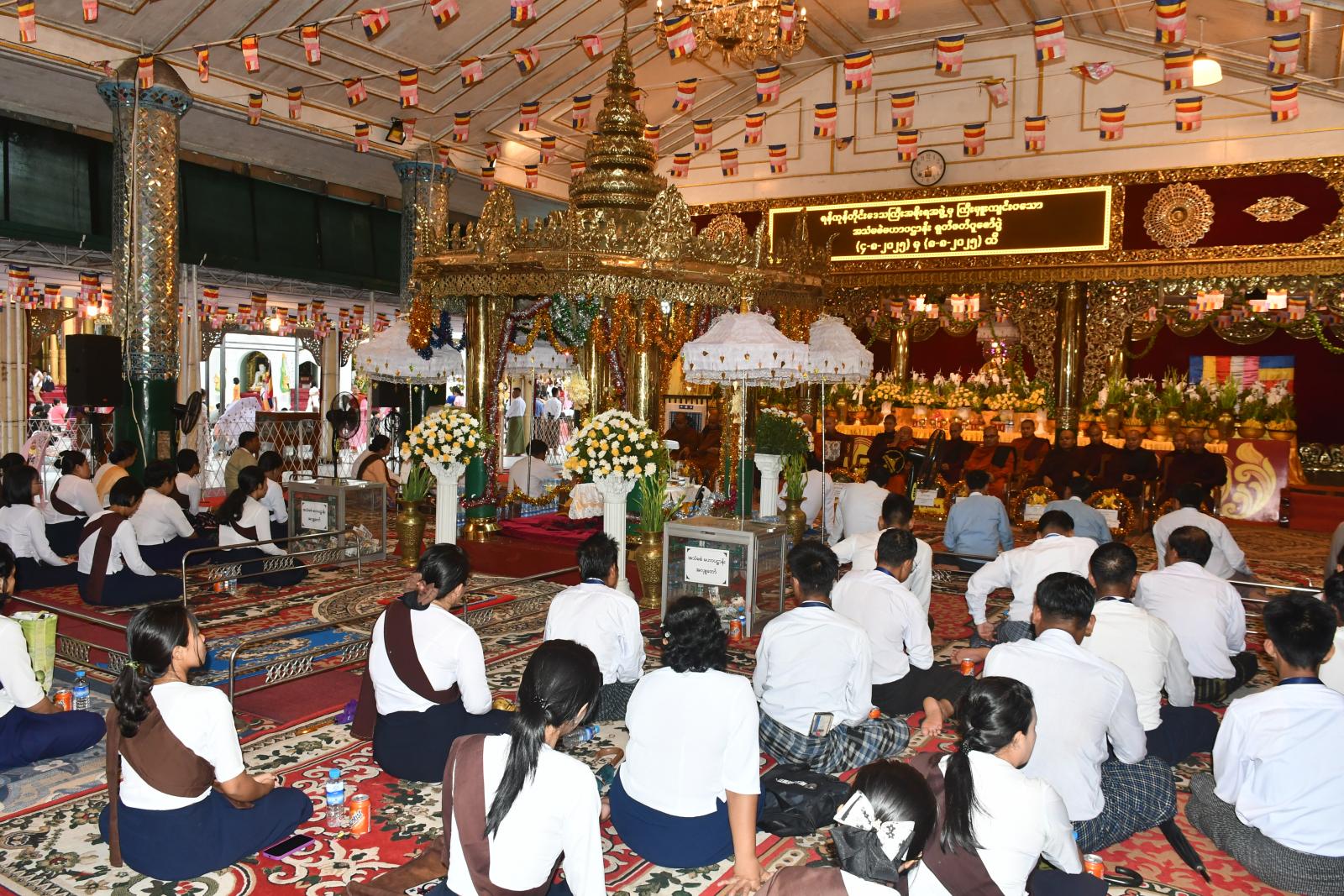 မြန်မာနိုင်ငံအတွင်းရှိ ရဟန်းရှင်လူပြည်သူများ ဘေးအန္တရာယ်ကင်းရှင်းစေရန်အတွက် ၂၀၂၅ ခုနှစ်၊ ဝါတွင်းကာလအတွင်း၌ ရန်ကုန်တိုင်းဒေသကြီးအစိုးရအဖွဲ့မှ ကြီးမှူးကျင်းပသော ဒုတိယအကြိမ် မြောက် အသံမစဲမဟာပဌာန်း ရွတ်ဖတ်ပူဇော်ပွဲ အောင်ပွဲအခမ်းအနားကို ယမန်နေ့ညနေပိုင်းက ရန်ကုန်တိုင်းဒေသကြီး၊ ရွှေတိဂုံစေတီတော်၊ မြောက်ဘက်မုခ်၊ ချမ်းသာကြီးတန်ဆောင်းတွင် ကျင်းပသည်။