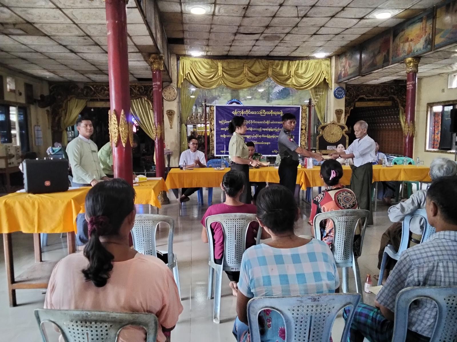 ရန်ကုန်တိုင်းဒေသကြီး၊ ဗိုလ်တထောင်ခရိုင်၊ မင်္ဂလာတောင်ညွန့်မြို့နယ်၌ မြို့နယ်အတွင်းသို့ ပြောင်းရွှေ့ရောက်ရှိလာသည့် နေရပ်စွန့်ခွာပြည်သူများအတွက် အမျိုးသားသဘာဝဘေးအန္တရာယ်ဆိုင်ရာ စီမံခန့်ခွဲမှုရန်ပုံငွေမှ ၂၀၂၅ ခုနှစ်၊ ဧပြီလ၊ မေလနှင့် ဇွန်လတို့အတွက် တစ်ဦးလျှင်(၃)လစာ ငွေကျပ် ၆၀,၀၀၀/-ပေးအပ်ခြင်းကို ယမန်နေ့နံနက်ပိုင်းက မင်္ဂလာတောင်ညွန့်ရပ်ကွက်၊ တောင်ညွန့်ကြီးဓမ္မာရုံတွင်လည်းကောင်း၊ မွန်းလွဲ (၂)နာရီအချိန်တွင် ပုသိမ်ညွန့်ရပ်ကွက်၊ သဒ္ဓမ္မဗျူဟာဓမ္မာရုံတို့တွင်လည်းကောင်း ကျင်းပပြုလုပ်ခဲ့သည်။