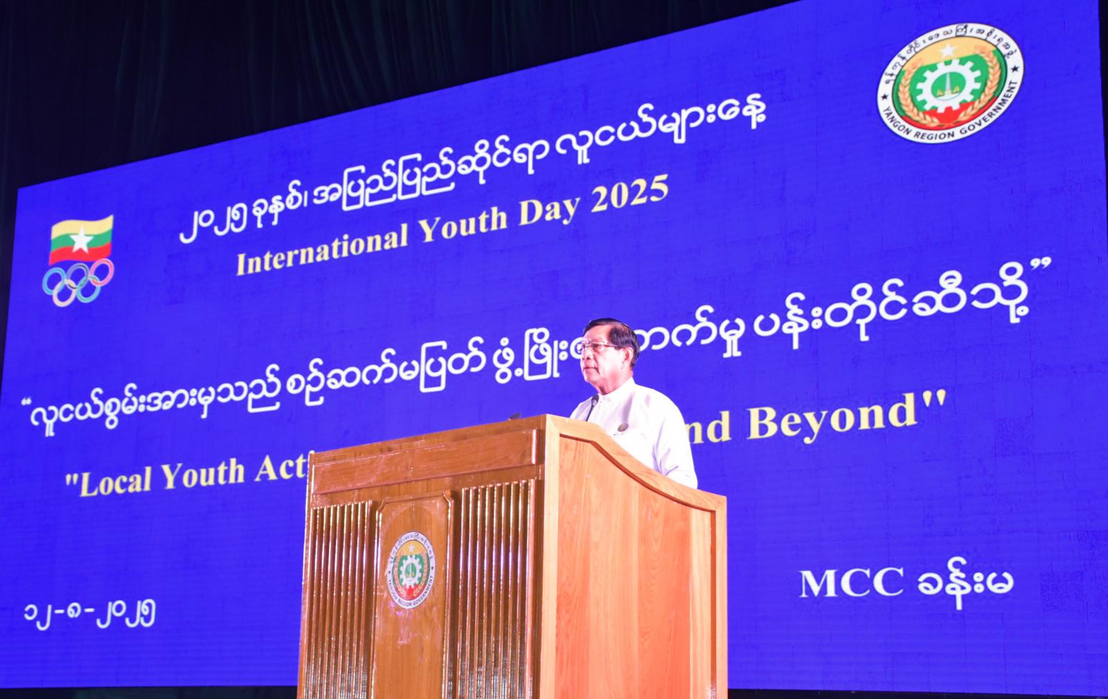 ရန်ကုန်တိုင်းဒေသကြီးအစိုးရအဖွဲ့ ရန်ကုန်တိုင်းဒေသကြီး လူငယ်ရေးရာကော်မတီမှ ကြီးမှူးကျင်းပသော ၂၀၂၅ ခုနှစ် အပြည်ပြည်ဆိုင်ရာလူငယ်များနေ့ အခမ်းအနားကို ယမန်နေ့နံနက် ၉ နာရီတွင် ရန်ကုန်မြို့၊ မရမ်းကုန်းမြို့နယ်၊ မင်းဓမ္မလမ်းရှိ မြန်မာကွန်ဗီးရှင်းစင်တာ(MCC)ခန်းမ၌ ကျင်းပရာ ရန်ကုန်တိုင်းဒေသကြီးအစိုးရအဖွဲ့ဝန်ကြီးချုပ် ဦးစိုးသိန်း၊ တိုင်းဒေသကြီး တရားလွှတ်တော်တရားသူကြီးချုပ်၊ အစိုးရအဖွဲ့ဝင်ဝန်ကြီးများ၊ တိုင်းဒေသကြီးဥပဒေချုပ်၊ လူငယ့်ရေးရာကော်မတီဝင်များ၊ ရန်ကုန်တိုင်းဒေသကြီး လူငယ့်ရေးရာအထောက်အကူပြုလုပ်ငန်းကော်မတီဝင်များ၊ ဆပ်ကော်မတီအသီးသီးမှ ကော်မတီဝင်များ လူငယ်(၁၈)ဖွဲ့မှဥက္ကဋ္ဌများနှင့် လူငယ်ကိုယ်စားလှယ်များ၊ တက္ကသိုလ်၊ ကောလိပ်များမှ လူငယ်ကိုယ်စားလှယ်များ၊ ဌာနဆိုင်ရာတာဝန်ရှိသူများ၊ ဖိတ်ကြားထားသော ဧည့်သည်တော်များ တက်ရောက်ကြသည်။