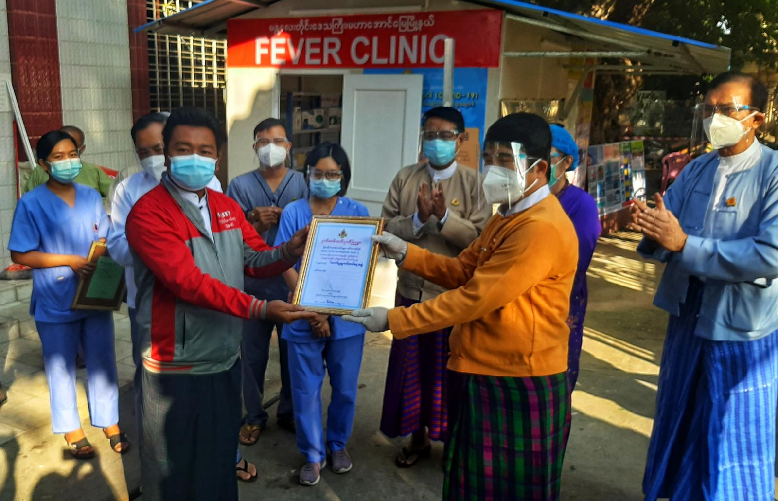 ရှေးဦးစွာ မန္တလေးတိုင်းဒေသကြီး အစိုးရအဖွဲ့ဝင် လျှပ်စစ်စွမ်းအင်နှင့်ဆောက်လုပ်ရေးဝန်ကြီးဦးဇာနည်အောင်က မဟာအောင်မြေမြို့နယ် Fever Clinicအတွင်း ပြင်ဆင်ထားရှိမှုများကို ကြည့်ရှုခဲ့ပြီး Fever Clinic အဆောက်အဦးကုန်ကျစရိတ်များ လှူဒါန်းခဲ့သော မဟာလူမှုကယ်ဆယ်ရေးအဖွဲ့ကို ဂုဏ်ပြုမှတ်တမ်းလွှာပေးအပ်ခဲ့ရာ ယင်းအဖွဲ့ကိုယ်စား ဥက္ကဋ္ဌ ကိုသက်ကြီးက လက်ခံရယူခဲ့သည်။ ဆက်လက်၍ မြန်မာနိုင်ငံဆရာဝန်အသင်း ( မန္တလေးတိုင်းဒေသကြီး) ဥက္ကဋ္ဌ ပါမောက္ခ ဒေါက်တာခင်မောင်မြင့်က Fever Clinic အတွက် အဲယားကွန်း လှူဒါန်းခဲ့သော မန္တလေး လေအေးစက်နှင့် ဆက်စပ်သော စက်မှုနည်းပညာရှင်းများအသင်းကို ဂုဏ်ပြုမှတ်တမ်းလွှာပေးအပ်ခဲ့ရာ ယင်းအသင်း ဥက္ကဋ္ဌ ဦးသိန်းဟန်က လက်ခံရယူခဲ့သည်။