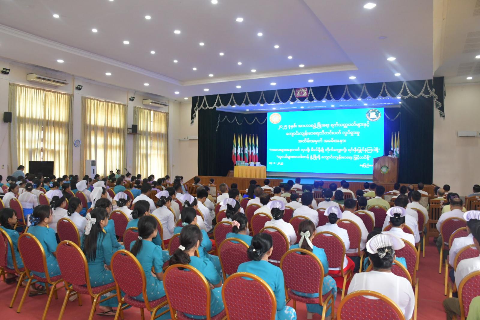 ဦးစွာ နေပြည်တော်ကောင်စီဥက္ကဋ္ဌ ဦးသန်းထွန်းဦးက အဖွင့်အမှာစကားပြောကြားရာ အမျိုးသားကာကွယ်ရေးနှင့် လုံခြုံရေးကောင်စီ၏ ဦးတည်ချက်(၄)ရပ်တွင်ပါဝင်သည့် နိုင်ငံတော်စဉ်ဆက်မပြတ် ဖွံ့ဖြိုးတိုးတက် ခိုင်မာစေရေးအတွက် အမျိုးသားပညာရေးကဏ္ဍ၊ ကျန်းမာရေးကဏ္ဍတို့ကို အလေးထားမြှင့်တင်ရေးကို ကြိုးပမ်းအကောင်အထည်ဖော်ရာမှာ ကျန်းမာရေးအဆင့်မြှင့်ကျောင်းများ ပေါ်ထွန်းလာရေးနှင့် လူတိုင်းရောဂါဘယ ကင်းရှင်းရေးကို အဓိကထားဆောင်ရွက်ကြရန်လိုကြောင်း၊ ကလေးငယ်များ ခန္ဓာကိုယ်ကြီးထွားဖွံ့ဖြိုးစေရန်၊ ကျောင်းနေအရွယ်ကလေးများ ဉာဏ်ရည်ဖွံ့ဖြိုးစေရန်နှင့် ပြည်သူအားလုံး ကိုယ်ခံအားကောင်းပြီး ရောဂါဘယများ ကာကွယ်တားစည်းနိုင်ရေးအတွက် လုံလောက်မျှတသည့် အစားအစာကို အပြည့်အဝစားသုံးရန်လိုအပ်ပါကြောင်း၊ ၂၀၀၉ ခုနှစ်မှ စတင်ပြီး အာဟာရဖွံ့ဖြိုးရေး ရက်သတ္တပတ်များအဖြစ် သတ်မှတ်ကာ အာဟာရဖွံ့ဖြိုးရေး ရက်သတ္တပတ်လှုပ်ရှားမှုများကို ဩဂုတ်လ တစ်လလုံး ဆောင်ရွက်ခဲ့ခြင်းဖြစ်ကြောင်း၊ အာဟာရဖွံ့ဖြိုးမှုမြှင့်တင်ရေးလုပ်ငန်းများသည် ကဏ္ဍပေါင်းစုံပါဝင်သည့် ကွင်းဆက်လုပ်ငန်းကြီးဖြစ်ပြီး အားလုံးဝိုင်းဝန်းပူးပေါင်းပါဝင်ဆောင်ရွက်ကြရန်လိုအပ်ပါကြောင်း၊ အာဟာရဖွံ့ဖြိုးရေးလှုပ်ရှားမှု ရက်သတ္တပတ်များအဖြစ် ပထမရက်သတ္တပတ်ကို မိခင်နို့စနစ်တကျတိုက်ကျွေးရေး ရက်သတ္တပတ်၊ ဒုတိယရက်သတ္တပတ်ကို ငါးနှစ်အောက်ကလေးများနှင့် ကျောင်းသားလူငယ်များ အာဟာရဖွံ့ဖြိုးရေးရက်သတ္တပတ်၊ တတိယရက်သတ္တပတ်ကို ကိုယ်ဝန်ဆောင်နှင့် နို့တိုက်မိခင်များ အာဟာရဖွံ့ဖြိုးရေးရက်သတ္တပတ်၊ စတုတ္ထရက်သတ္တပတ်ကို အိုင်အိုဒင်းချို့တဲ့မှုပပျောက်ရေးရက်သတ္တပတ် ဟူ၍ သတ်မှတ်ပြီး ဆောင်ရွက်နေခြင်းဖြစ်ကြောင်း၊ အနာဂတ်၏သားကောင်းရတနာများဖြစ်သည့် ကျောင်းသားလူငယ်များအနေဖြင့် သန့်ရှင်းလတ်ဆတ်ပြီး အာဟာရပြည့်ဝသော အစားအစာများ ရွေးချယ်စားသုံးတတ်ရန် ပညာပေးခြင်း၊ ကျောင်းတွင်း အာဟာရကျွေးမွေးခြင်း၊ သံဓာတ်ကြွယ်ဝသည့် အစားအစာများ စားသုံးရန် ပညာပေးခြင်း၊ သံဓာတ်အားဆေးများဖြန့်ဝေပေးခြင်းများကို ယခုနှစ်အတွက် ဆောင်ပုဒ်ဖြစ်သည့် "လူငယ်များ ဗလငါးတန်ဖွံ့ဖြိုးဖို့ ကျောင်းကျန်းမာရေး မြှင့်တင်စို့" ဆိုသည့်အတိုင်း ကျောင်းကျန်းမာရေး သီတင်းပတ်လှုပ်ရှားမှုများကို ဆောင်ရွက်ပေးနေကြောင်း၊ ပြည်သူအားလုံး အာဟာရပြည့်ဝပြီး အနာရောဂါကင်းရှင်းရေး၊ မိခင်နှင့်ကလေးသေနှုန်းများ ကျဆင်းစေရေး၊ အာဟာရပြည့်ဝပြီး ကာယနှင့် ဉာဏဖွံ့ဖြိုးသည့် မျိုးဆက်သစ်လူငယ်များ ပေါ်ထွက်လာစေရန်နှင့် ကလေးများ၏ အနာဂတ်ကျန်းမာဖွံ့ဖြိုး သာယာစေရေးအတွက် အာဟာရဖွံ့ဖြိုးရေးလုပ်ငန်းမ