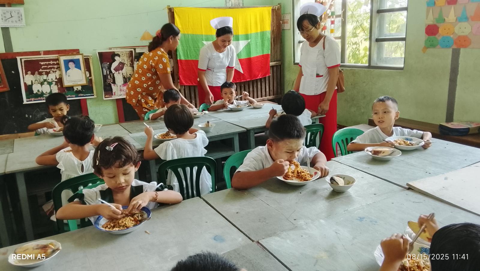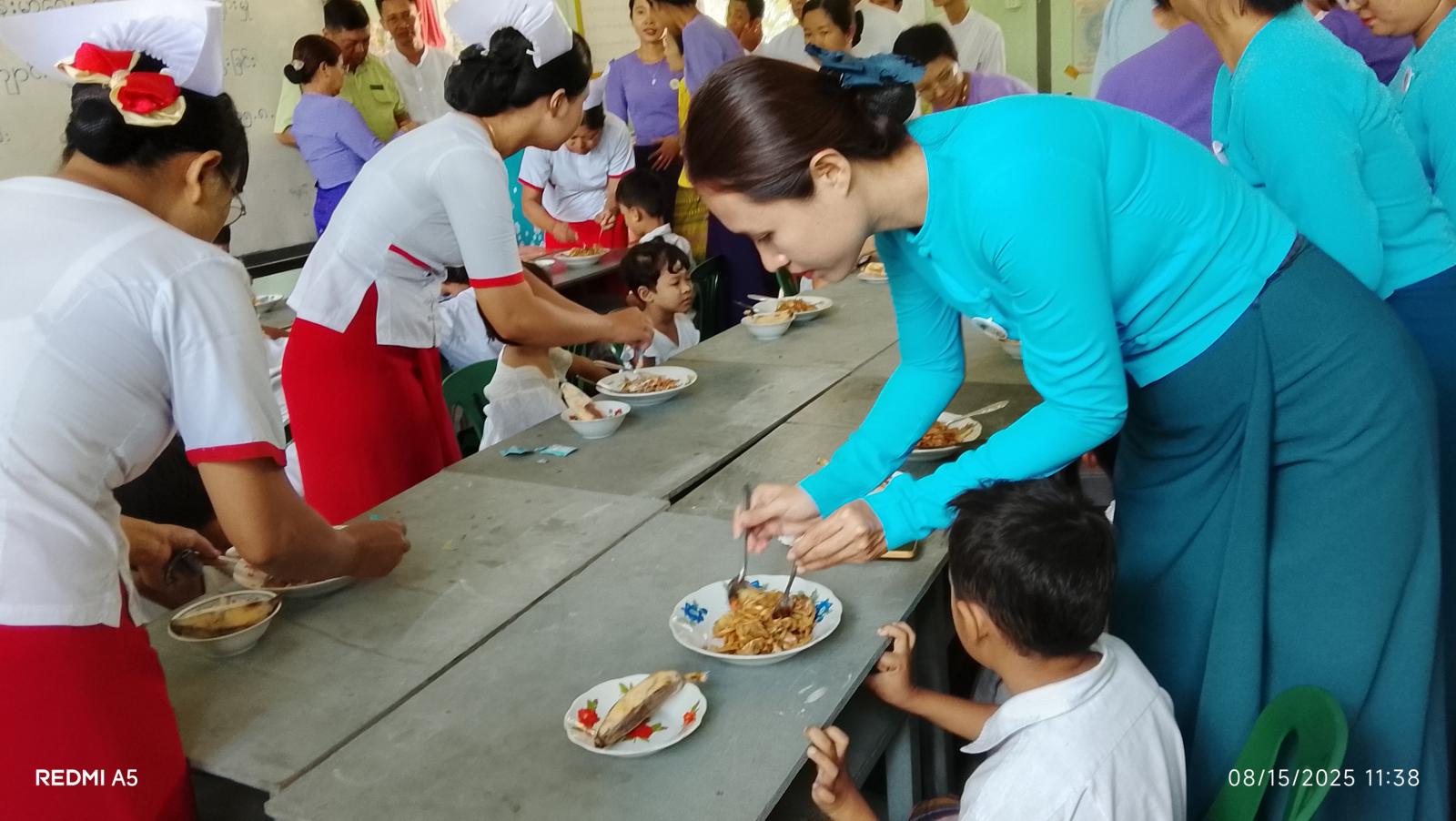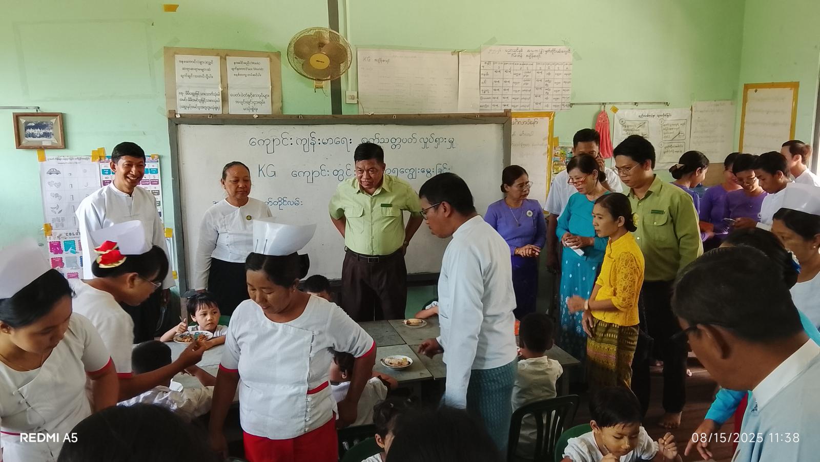 အခမ်းအနားအပြီးတွင် မြို့နယ်စီမံခန့်ခွဲရေးနှင့်အုပ်ချုပ်ရေးကော်မတီဥက္ကဋ္ဌနှင့်မိခင်နှင့် ကလေးစောင့် ရှောက်ရေးအသင်းဥက္ကဋ္ဌတို့က ၅ နှစ်အောက် KG ကျောင်းသား ကျောင်းသူလေးများအား သံချဆေးနှင့်ဘီတာမင်အေတိုက်ကျွေးနေမှု၊ ကျန်းမာရေးစစ်ဆေးပေးနေမှု၊ အဟာရဖွံ့ဖြိုးရေးအစားအစာ ကျွေးမွေးနေမှုနှင့် ကျောင်းသား၊ ကျောင်းသူ ၃၄၀ဦးအား အာဟာရ ကြက်သားဆန်ပြုတ် တိုက်ကျွေးနေမှုများအားလှည့်လည်ကြည့်ရှုစစ်ဆေးခဲ့ကြောင်း သိရသည်။