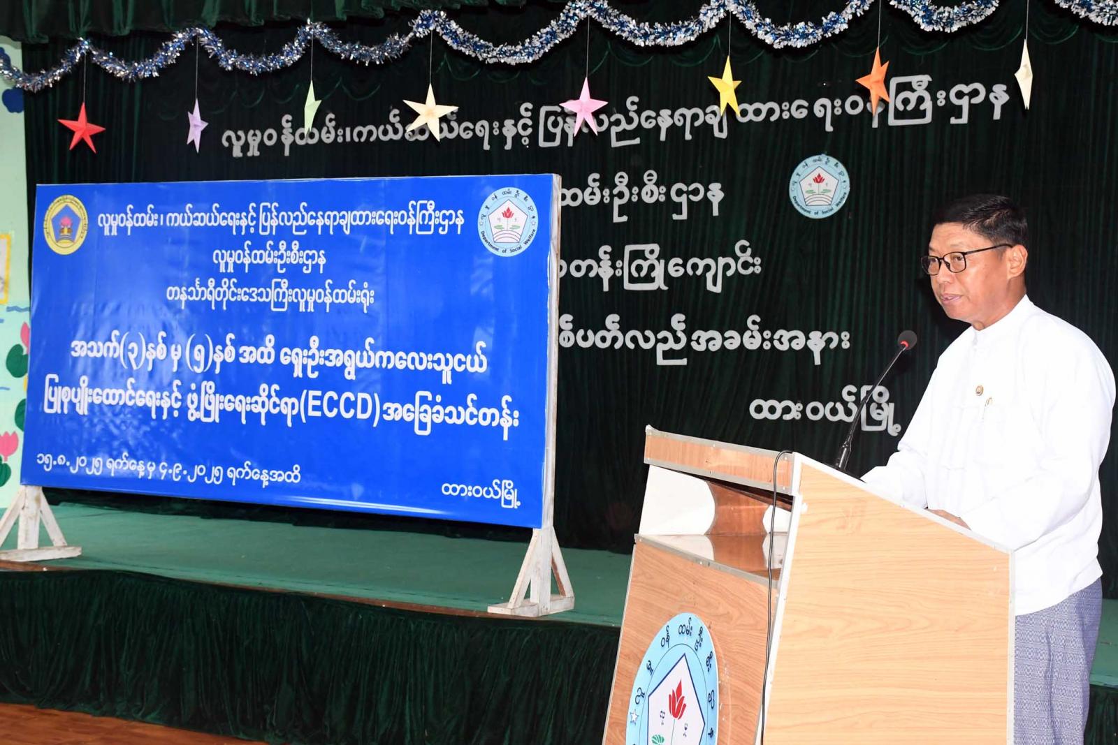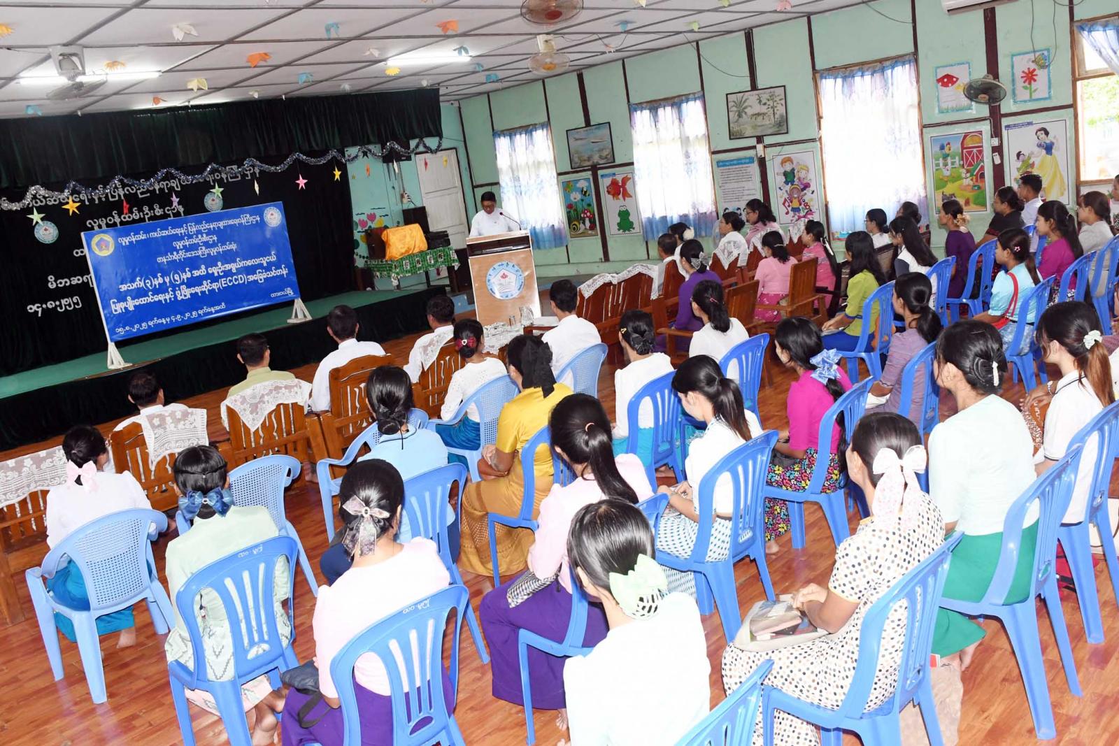 အခမ်းအနားတွင် တိုင်းဒေသကြီးအစိုးရအဖွဲ့လူမှုရေးရာဝန်ကြီးဦးသက်နိုင်က ရှေးဦးအရွယ်ကလေးသူငယ်ပြုစုပျိုးထောင်ရေးနှင့် ဖွံ့ဖြိုးရေးနည်းစနစ်များကိုသိရှိပြီး စွမ်းဆောင်ရည်ပြည့်ဝစွာဖြင့် ကလေးများအား စနစ်တကျပြုစုပျိုးထောင်နိုင်ရန်နှင့် ရှေးဦးအရွယ်ကလေးသူငယ်ပြုစုပျိုးထောင်ရေးနှင့် ဖွံ့ဖြိုးရေးနည်းပညာများပြည်သူလူထုအတွင်း ကျယ်ပြန့်စွာရောက်ရှိနိုင်စေရန်ရည်ရွယ်၍ ယခုသင်တန်းအား ဖွင့်လှစ်ပေးရခြင်းဖြစ်ကြောင်း၊ ရှေးဦးအရွယ်ကလေးသူငယ်များကို ဖွံ့ဖြိုးမှု(၅)ရပ်ဖြစ်သည့် ရုပ်ပိုင်းဆိုင်ရာဖွံ့ဖြိုးမှု၊ လူမှုဆက်ဆံရေးဆိုင်ရာဖွံ့ဖြိုးမှု၊ စိတ်လှုပ်ရှားခံစားမှုဆိုင်ရာဖွံ့ဖြိုးမှု၊ အသိဉာဏ်ဆိုင်ရာဖွံ့ဖြိုးမှုများနှင့် စာရိတ္တဆိုင်ရာဖွံ့ဖြိုးမှုများရရှိအောင် ပြုစုပျိုးထောင်လေ့ကျင့်ပေးရမှာ ဖြစ်ကြောင်း၊ ဖွံ့ဖြိုးမှုအားလုံးသည် တစ်ခုနှင့်တစ်ခုဆက်စပ်မှုရှိသဖြင့် ဟန်ချက်ညီညီ ဖွံ့ဖြိုးမှုရရှိရန်လိုအပ်ကြောင်း၊ တိုင်းဒေသကြီးတွင် ရှေးဦးအရွယ်ကလေးသူငယ် ပြုစုပျိုးထောင်ရေးနှင့်ဖွံ့ဖြိုးရေးလုပ်ငန်း ကြီးကြပ်ရေးအဖွဲ့ကို ဖွဲ့စည်းထားပြီး တိုင်းဒေသကြီးအတွင်း ရှေးဦးအရွယ်ကလေး သူငယ်ပြုစုပျိုးထောင်ရေးလုပ်ငန်းများကို ဆောင်ရွက်ပေးလျက်ရှိကြောင်း၊ နိုင်ငံတော်၏ အနာဂတ်လူ့စွမ်းအားအရင်းအမြစ် များဖြစ်သည့် ရှေးဦးအရွယ် ကလေးသူငယ်များအနေဖြင့် နည်းစနစ်မှန်မှန်နှင့် စနစ်တကျပြုစုပျိုးထောင်မှုကိုရရှိရန်အရေးကြီး ကြောင်း၊ ဒါ့ကြောင့်ရှေးဦးအရွယ်ကလေးသူငယ်ပြုစုပျိုးထောင်ရေးနှင့် ဖွံ့ဖြိုးရေးကဏ္ဍတွင် တာဝန်ယူဆောင်ရွက်ရသည့် ဆရာ/ဆရာမများအနေဖြင့် အသက်အရွယ်အလိုက် ကလေးပြုစုစောင့်ရှောက်မှုနည်းစနစ်များကို ကျွမ်းကျွမ်းကျင်ကျင်တတ်မြောက်ရန် အရေးကြီးကြောင်း၊ ရှေးဦးအရွယ်ကလေးသူငယ်တွေကို ပြုစုပျိုးထောင်ရာတွင် စေတနာ၊ ဝါသနာ၊ ကရု ဏာ၊ အကြင်နာ၊ အနစ်နာ စသည့် “နာ(၅)နာ”အပြင် အသိပညာ၊ အတတ်ပညာ၊ ကျွမ်းကျင်မှု၊ စွမ်းရည်၊ အချိန်၊ မေတ္တာစသည့် အရင်းအနှီးများ လိုအပ်သောကြောင့် မူကြိုဆရာအလုပ်မှာ လွန်စွာတန်ဖိုးရှိပြီး မွန်မြတ်လှသော လုပ်ငန်းတစ်ရပ်ဖြစ်ကြောင်း၊ မူကြိုဆရာ/ဆရာမများအနေဖြင့် မိမိကျောင်းများသို့ လာရောက်ကြမည့် ရင်သွေးငယ်လေးများကို ဘက်စုံဖွံ့ဖြိုးတိုးတက်ပြီး ဘဝတစ်သက်တာအတွက် အလေ့အကျင့်ကောင်းများရရှိစေရန် နည်းစနစ်မှန်ကန်စွာဖြင့် ပြုစုပျိုးထောင်ပေးရုံသာမက မိဘအသိပညာပေးခြင်းလုပ်ငန်း၊ ရပ်ရွာအခြေပြုလုပ်ငန်းများကိုပါဆောင်ရွက်ပြီး နိုင်ငံတော်၏ အနာဂတ်လူ့စွမ်းအားအရင်းအမြစ် ဖွံ့ဖြိုးရေးလုပ်ငန်းမှာ တစ်တပ်တစ်အား ပါဝင်ဆောင်ရွက်ပေးကြရန်လိုအပ်ကြောင်း ပြေ