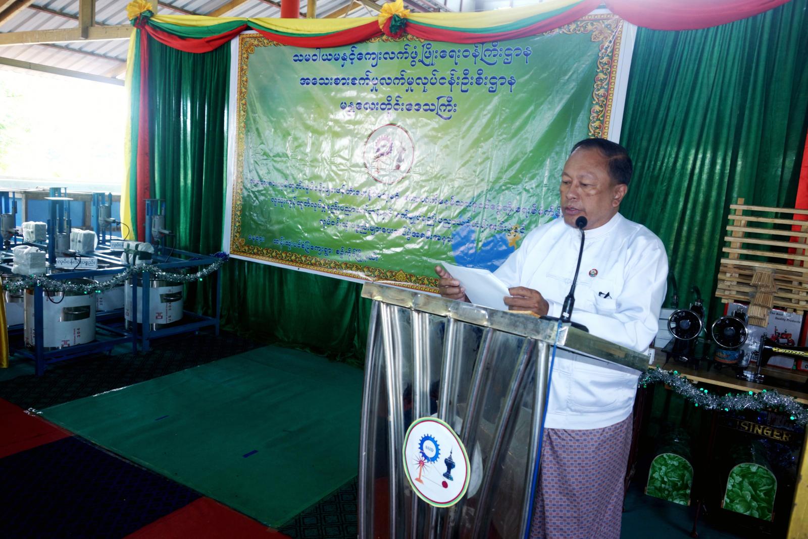 ရှေးဦးစွာ အခမ်းအနားတွင် မန္တလေးတိုင်းဒေသကြီးအစိုးရအဖွဲ့၊ လမ်းပန်းဆက်သွယ်ရေးဝန်ကြီး ဦးအောင်ဇော်ဦးက အဖွင့်အမှာစကားပြောကြားခဲ့ပြီး အသေးစားစက်မှုလက်မှုလုပ်ငန်းဦးစီးဌာန ရုံးချုပ် (နေပြည်တော်)မှ ဒုတိယညွှန်ကြားရေးမှူးချုပ် (နည်းပညာ) ဒေါ်ငြိမ်းအေးက အသေးစားကုန်ထုတ်လုပ်ငန်းများ ဖန်တီးပေးနိုင်ရေးနှင့် ကျေးလက်နေမိသားစု ဝင်ငွေတိုးရေး စီမံကိန်းနှင့်စပ်လျဉ်း၍ ရှင်းလင်းပြောကြားခဲ့သည်။