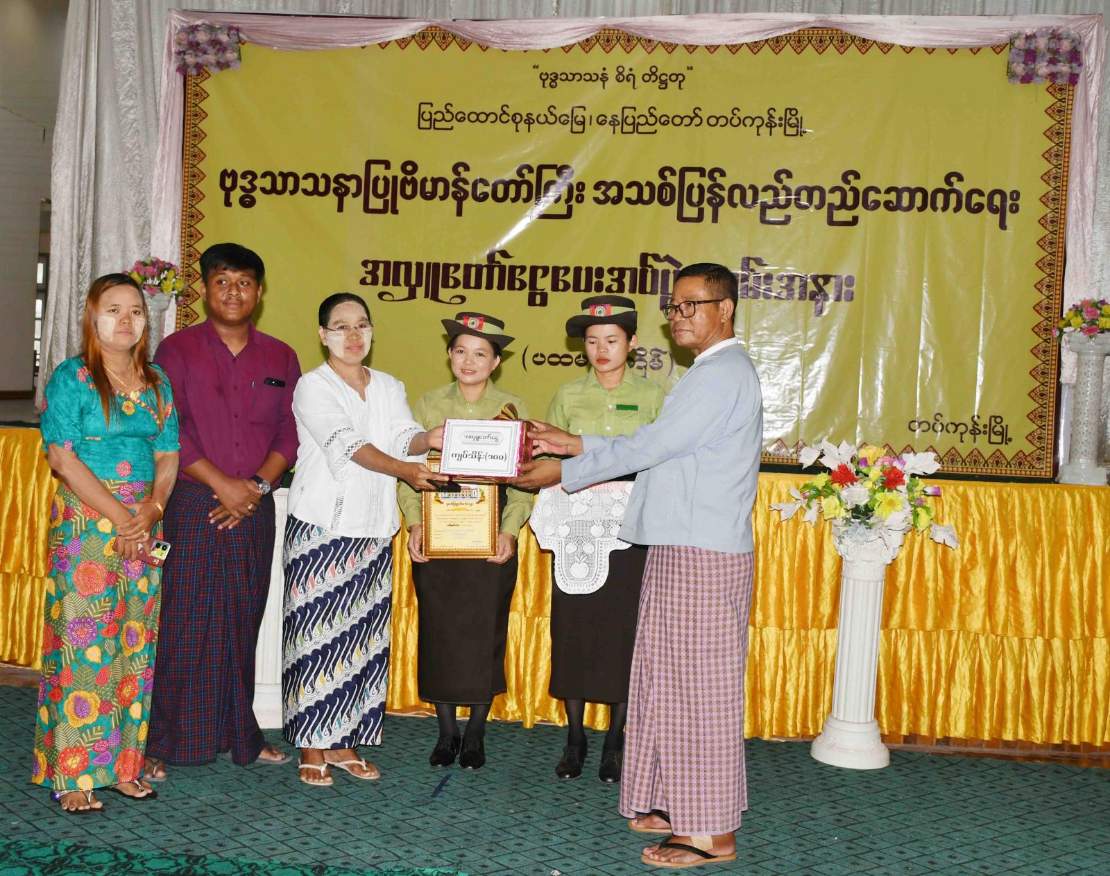 အဆိုပါအခမ်းအနားတွင် ဗုဒ္ဓသာသနာပြုဗိမာန်တော်ကြီး အသစ်ပြန်လည်တည်ဆောက်ရေး ဦးစီးကော်မတီဥက္ကဋ္ဌ ဦးအေးလူက အဖွင့်အမှာစကားပြောကြားပြီး၊ မြို့နယ်စီမံခန့်ခွဲရေးနှင့် အုပ်ချုပ်ရေးကော်မတီအဖွဲ့ဝင် ဗိုလ်မှူးဝင်းထွဋ်အောင်က တည်ဆောက်မည့် လုပ်ငန်းအခြေအနေများအား ရှင်းလင်းတင်ပြခဲ့ပြီးနောက် ဗုဒ္ဓသာသနာပြုဗိမာန်တော်ကြီး အသစ်ပြန်လည်တည်ဆောက်ရေး ဦးစီးကော်မတီဥက္ကဋ္ဌ၊ မြို့နယ်ဥပတ္ထမ္ဘကအဖွဲ့ဥက္ကဋ္ဌ၊ တည်ဆောက်ရေးနှင့် ထိန်းသိမ်းရေးလုပ်ငန်းကော်မတီဥက္ကဋ္ဌ၊ ဘဏ္ဍာငွေရှာဖွေရေးကော်မတီဥက္ကဋ္ဌ၊ မြို့နယ်စီမံခန့်ခွဲရေးနှင့် အုပ်ချုပ်ရေးကော်မတီအဖွဲ့ဝင်များနှင့် တာဝန်ရှိသူများက အလှူရှင် (၉၄)ဦး၏ အလှူငွေများ လက်ခံ၍ ဂုဏ်ပြုမှတ်တမ်းလွှာများ ပြန်လည်ပေးအပ်သည်။