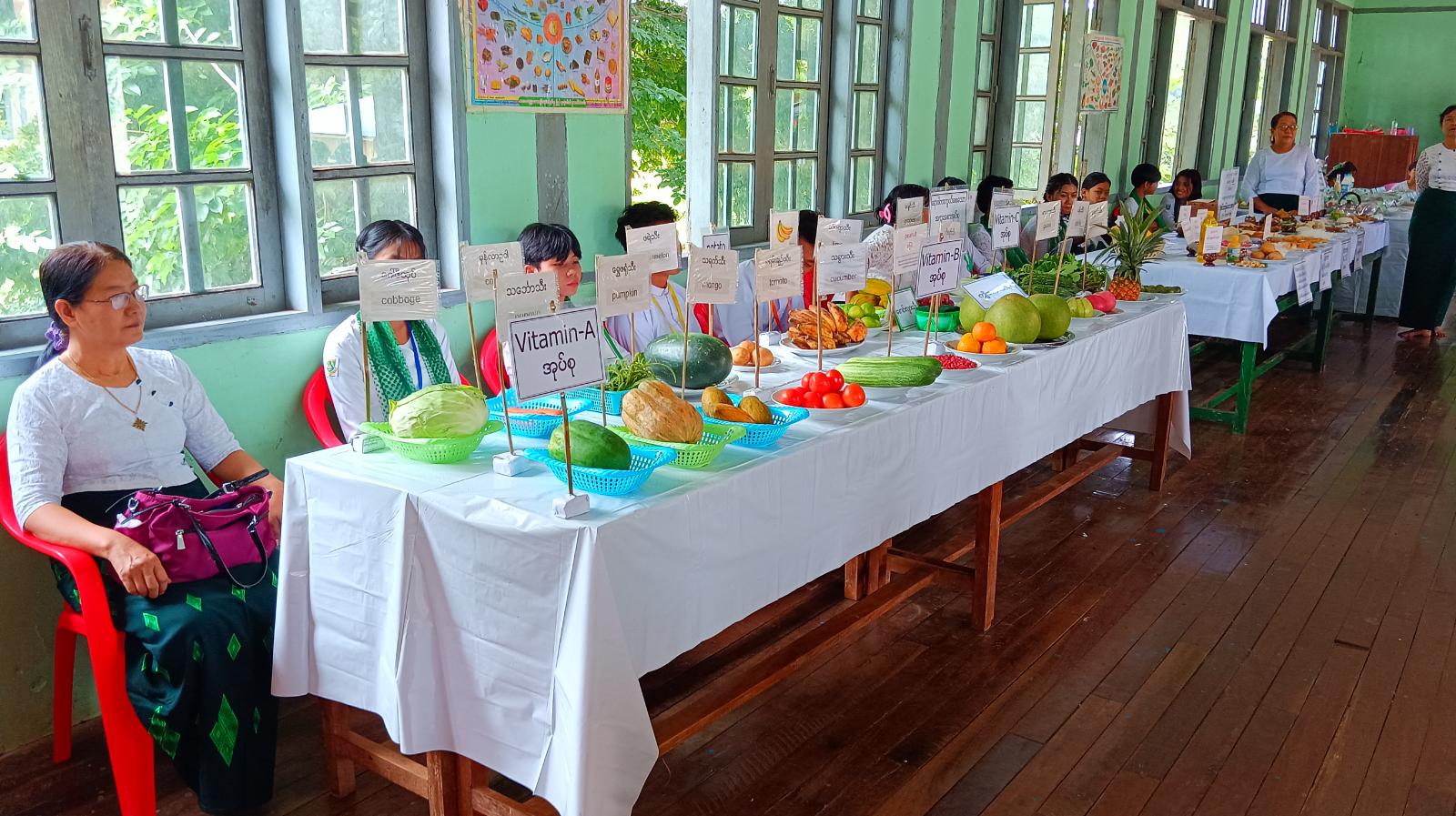 ထို့နောက်အခမ်းအနားသို့တက်ရာက်လာသော မြို့နယ်စီမံခန့်ခွဲရေးနှင့်အုပ်ချုပ်ရေးကော်မတီဥက္ကဋ္ဌနှင့်အဖွဲ့ဝင်များ၊ မြို့နယ်ဆရာဝန်ကြီးနှင့်ကျန်းမာရေးဝန်ထမ်းများ၊ ဌာနဆိုင်ရာများ၊ အမျိုးသမီးရေးရာ၊ မိခင်နှင့်ကလေးစောင့်ရှောက်ရေးအသင်းဥက္ကဋ္ဌနှင့်အဖွဲ့ဝင်များ၊ ဖိတ်ကြားထားသူများက ကျောင်းသား၊ ကျောင်းသူများ ခင်ကျင်းပြသထားသည့် အာဟာရအုပ်စုသုံးအုပ်စုတွင်ပါဝင်သည့် အင်အားဖြစ်စေသောအစားအစာ၊ ရောဂါကာကွယ်စေသောအစားအစာနှင့် ခန္ဓာကိုယ်ကြီးထွားစေသောအစားအစာများအား လှည့်လည်ကြည့်ရှုရာ ကျောင်းသား၊ ကျောင်းသူများက အစားအစာများတွင်ဗီတာမင်ပါဝင်မှုများ ကို ရှင်းလင်းပြောကြားခဲ့ကြောင်း သိရသည်။