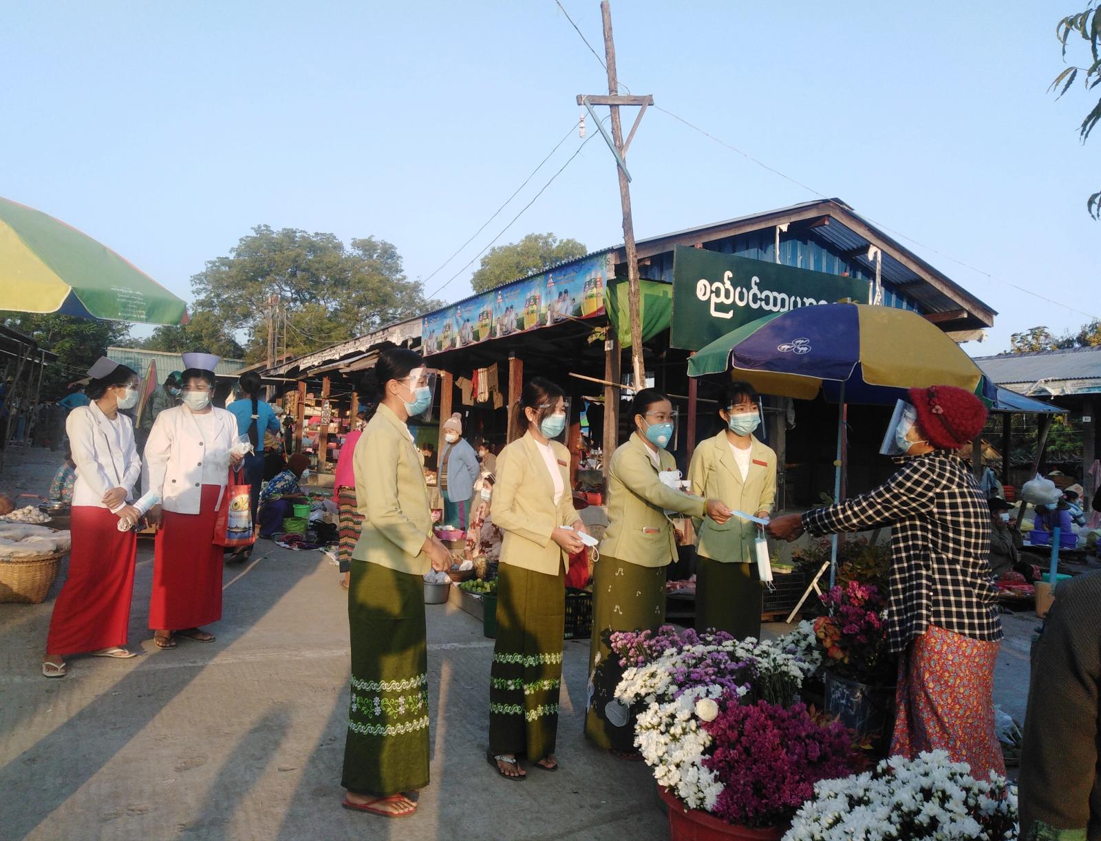 ထိုသို့ နှာခေါင်းစည်း (Mask)များ အခမဲ့ဖြန့်ဝေရာတွင် မြို့နယ်ကိုဗစ်-၁၉ရောဂါတားဆီးကာကွယ်ရေး နှင့်အရေးပေါ် တုံ့ပြန်ရေးကော်မတီအဖွဲ့ဝင်များ၊ ဌာနဆိုင်ရာတာဝန်ရှိသူများနှင့် (NGO) အဖွဲ့ဝင်များ ပူးပေါင်း၍ မြို့နယ်စည်ပင်သာယာဈေးရှိ ဈေးရောင်း/ဈေးဝယ်ပြည်သူများအား နှာခေါင်းစည်း (Mask)များ တပ်ဆပ်ပြီး မှသာ ဈေးရောင်း/ဈေးဝယ် ပြုလုပ်ကြရန်၊ မြို့နယ်စည်ပင်သာယာရေးကော်မတီက သတ်မှတ်ထားသော နေရာများ၌သာ ဈေးရောင်း/ဈေးဝယ်ပြုလုပ်ကြရန်နှင့် ကျန်းမာရေးနှင့် အားကစားဝန်ကြီးဌာန၏ ကိုဗစ်-၁၉ ရောဂါကာကွယ်ရေး အသိပေးထုတ်ပြန်ချက်များအား လိုက်နာဆောင်ရွက်ကြရန် အသိပညာ ပေးဟောပြောခဲ့ပြီး နှာခေါင်းစည်း(Mask)များအား အခမဲ့ ဖြန့်ဝေပေးခဲ့ကြောင်းသိရသည်။