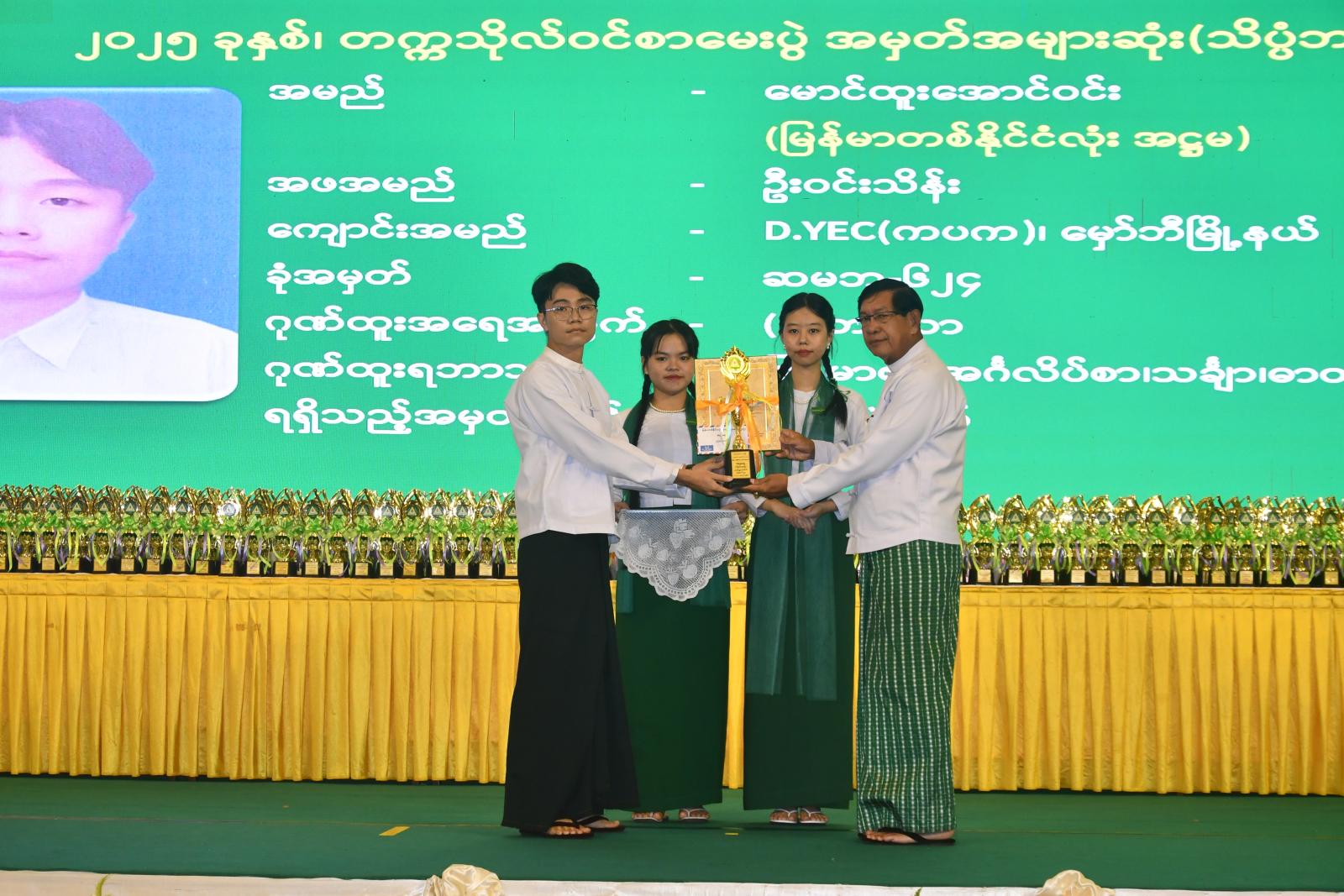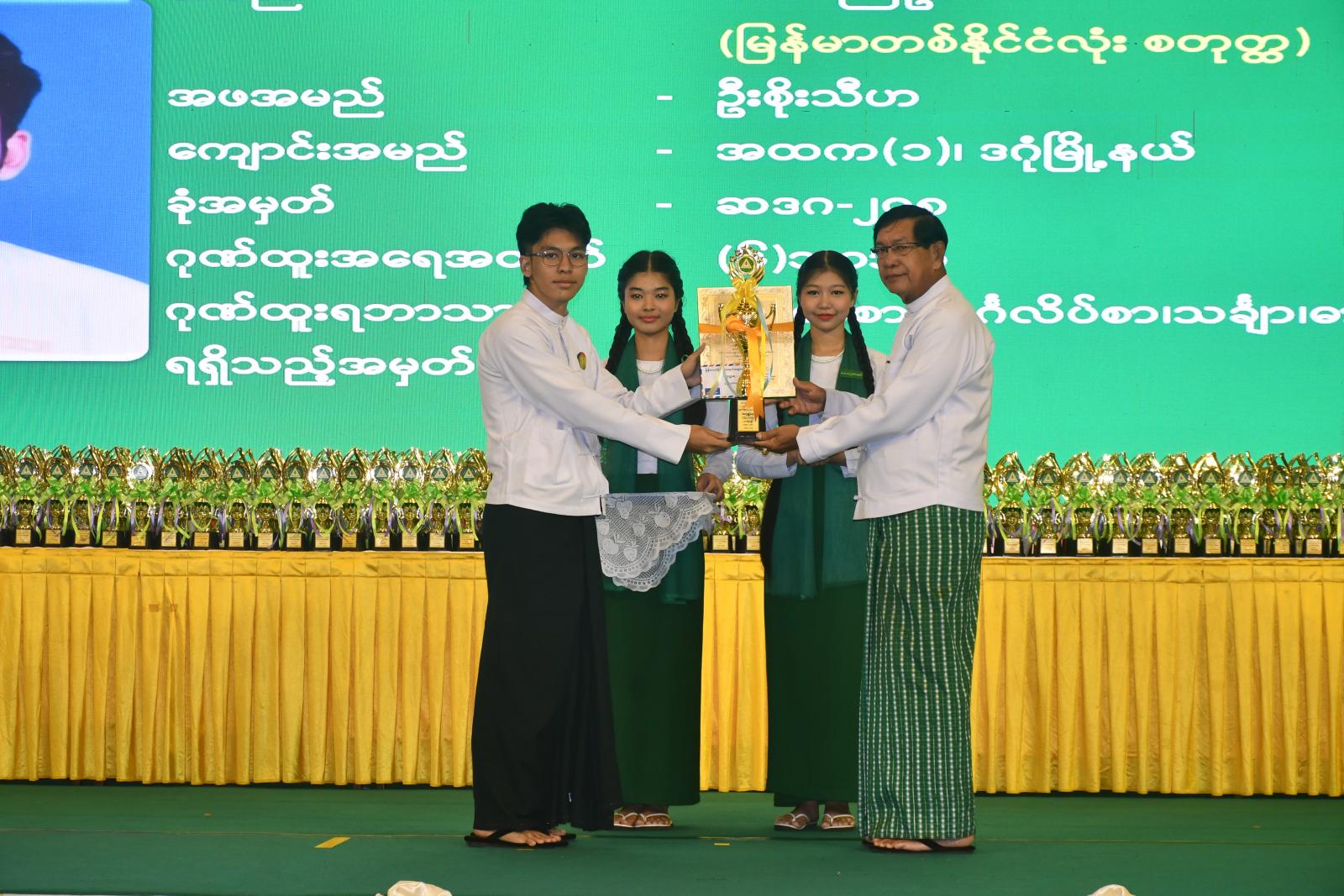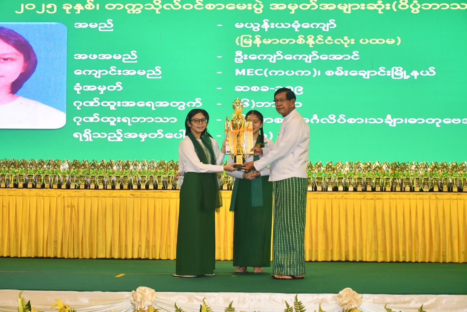 ဆက်လက်၍ (၄)ဘာသာ (၃၂၂)ဦး၊ (၃)ဘာသာ (၆၀၀)ဦး၊ (၂)ဘာသာ (၉၆၅)ဦးနှင့် (၁)ဘာသာ (၁၅၇၇)ဦး ဂုဏ်ထူးများရရှိသည့် ကျောင်းသား၊ ကျောင်းသူများအား ခရိုင်အလိုက်ကိုယ်စားပြု ပြန်လည်ချီးမြှင့်ရန်အတွက် ရန်ကုန်တိုင်းဒေသကြီး ပညာရေးမှူးရုံး၊ ဒုတိယညွှန်ကြားရေးမှူးချုပ် ဒေါက်တာချိုချိုမြတ်အောင်က ခရိုင်ပညာရေးမှူးများထံ ဆုတံဆိပ်များ၊ မှတ်တမ်းလွှာများနှင့် ချီးမြှင့်ငွေများကို ပေးအပ်သည်။