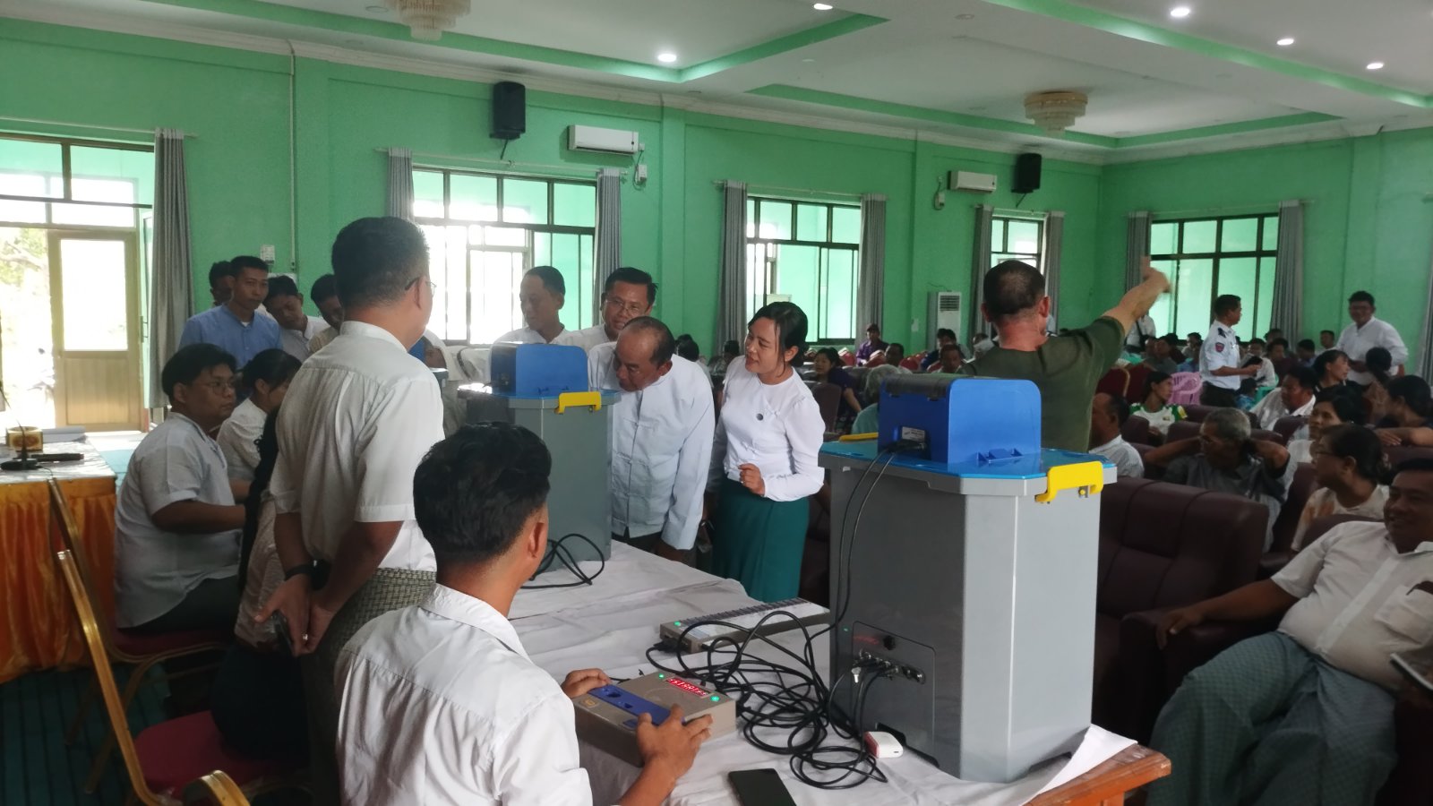 ပဲခူးတိုင်းဒေသကြီး၊ တောင်ငူခရိုင် ရေတာရှည်မြို့နယ်၌ မြန်မာအီလစ်ထရောနစ်မဲပေးစက် (MEVM) နှင့် မဲပေးနည်းလက်တွေ့သရုပ်ပြ မဲပေးခြင်းကို ယနေ့နံနက် (၁၁) နာရီက မြို့တော်ခန်းမတွင် ကျင်းပပြုလုပ်ခဲ့သည်။