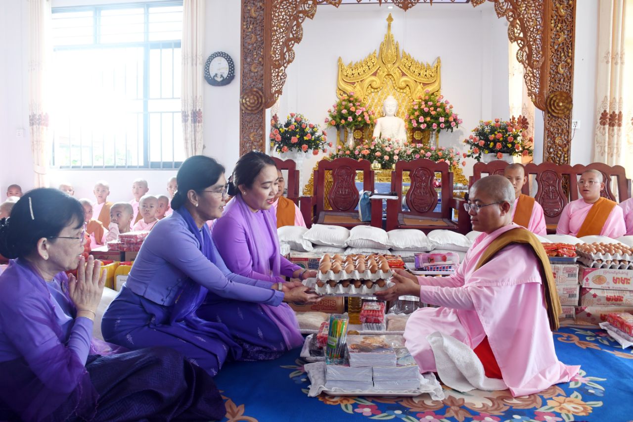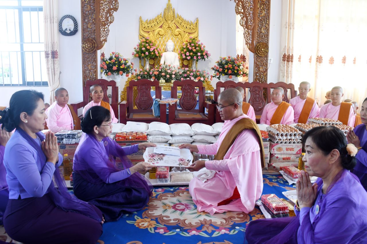 ဆက်လက်ပြီး မန္တလေးတိုင်းဒေသကြီးအမျိုးသမီးရေးရာအဖွဲ့ နာယကကြီးဒေါ်မမနှင့် အဖွဲ့ဝင်များ၊ ခရိုင်အမျိုးသမီးရေးရာအဖွဲ့ဥက္ကဋ္ဌနှင့် ခရိုင်အလုပ်အမှုဆောင်အဖွဲ့ဝင်များ၊ မြို့နယ်အမျိုးသမီးရေးရာအဖွဲ့ဥက္ကဋ္ဌနှင့် အလုပ်အမှုဆောင်များမှ ပညာ၀တီသီလရှင် စာသင်တိုက်ရှိ သီလရှင်ဆရာကြီး/ဆရာလေးအပါး(၆၀) အတွက် ဆန်၊ ဆီ၊ ကြက်ဥချောင်း၊ မုန့်မျိုးစုံ ၊ ခေါက်ဆွဲခြောက်နှင့်ကြက်ဥတို့အား တာဝန်ခံကျောင်းတိုက်ဆရာကြီးထံသို့ ထောက်ပံ့ပေးအပ် လှူဒါန်းခဲ့ပါကြောင်း သိရသည်။