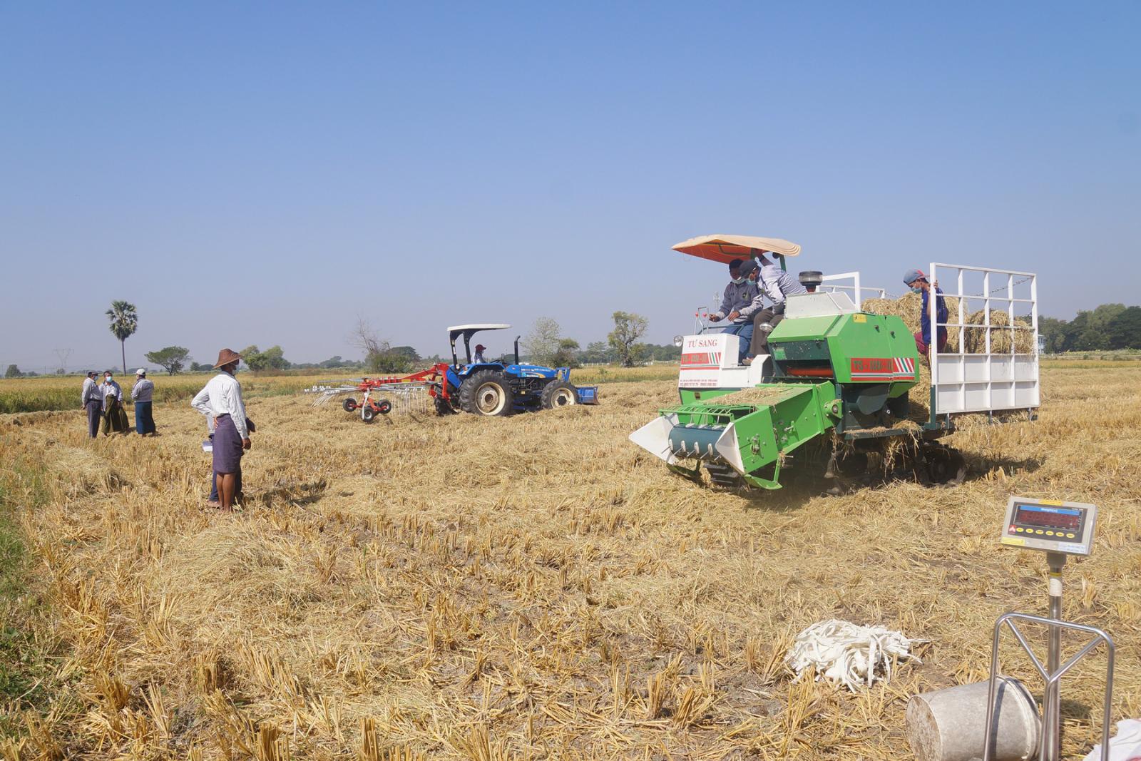 ထို့နောက် ကွင်းအမှတ် ၁၃၁၉၊ တောင်သူ ဦးတင်ထွန်းအောင် မိုးစပါးကောက်စိုက်စက် စံပြ စိုက်ခင်း၊ ပေါ်ဆန်း ဘေးကြား စပါး စိုက်ကွက်တွင် ရိတ်သိမ်းချွေလှေ့စက်ကြီးဖြင့် စပါးစံကွက်ရိတ်သိမ်းခဲ့ရာ တစ်ဧကလျှင် စပါးအစိုတင်း (၉၆)တင်းထွက်ရှိခြင်း၊ စပါးတစ်တင်းလျှင် (၁၁၀၀၀)ကျပ် ဈေးနှုန်းရရှိကြောင်းနှင့်တောင်သူ ဦးစိုးနိုင် စပါးစိုက်ကွက်တွင် ရိတ်သိမ်းချွေလှေ့စက်ကြီးနှင့်ရိတ် သိမ်းထားသည့်ကောက်ရိုးများအား ကောက်ရိုးစုစက်ကိရိယာ၊ ကောက်ရိုးထုံးစက် တို့ဖြင့် သရုပ် ပြသဆောင်ရွက်ပေးခဲ့ကြောင်း သိရသည်။
