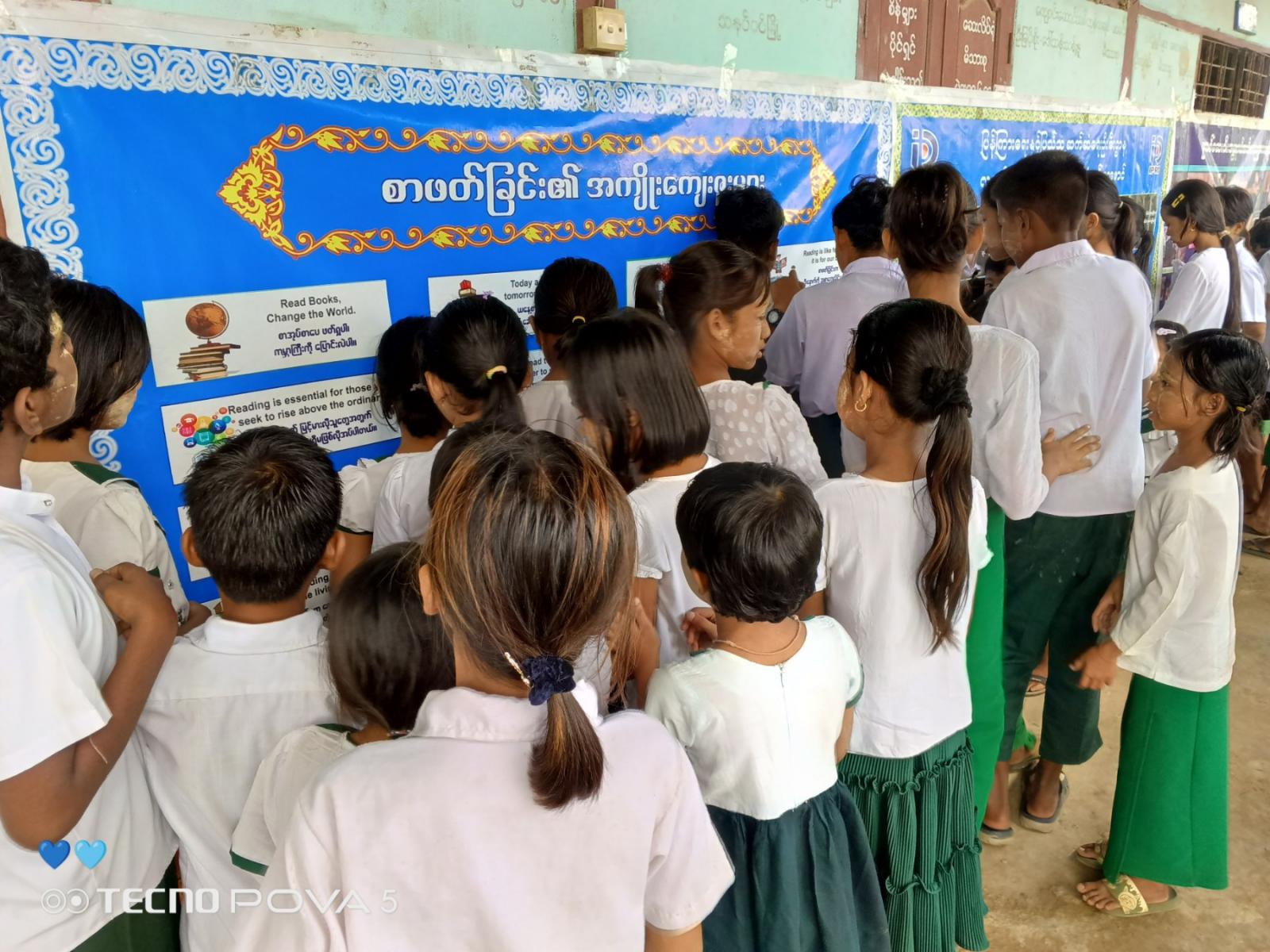 ထို့နောက် ပြန်ကြားရေးနှင့်ပြည်သူ့ဆက်ဆံရေးဦးစီးဌာနမှ စာဖတ်ရှိန်မြှင့်တင်ရေးနယ်လှည့်စာကြည့်တိုက်အဖြစ် ဒု-ဦးစီးမှူးဒေါ်မိမိခိုင်နှင့် ဝန်ထမ်းများက ကျောင်းသား/ကျောင်းသူများအား အသိပညာတိုးပွါးစေမည့် ရုပ်ပုံပြဇာတ်နှင့်ရုပ်ပုံပါပုံပြင်စာအုပ်များဖြင့်ပုံပြင်ပြောပြခြင်း၊ စာအုပ်များအားဖတ်ရှုစေခြင်းနှင့် မူးယစ်ဆေးဝါးအသိပညာပေးနံရံကပ်စာစောင်များကိုပြသခဲ့ရာ ကျောင်းသား/ကျောင်းသူများကစိတ်ပါ၀င်စားစွာ ကြည့်ရှုလေ့လာကြကြောင်း သိရသည်။