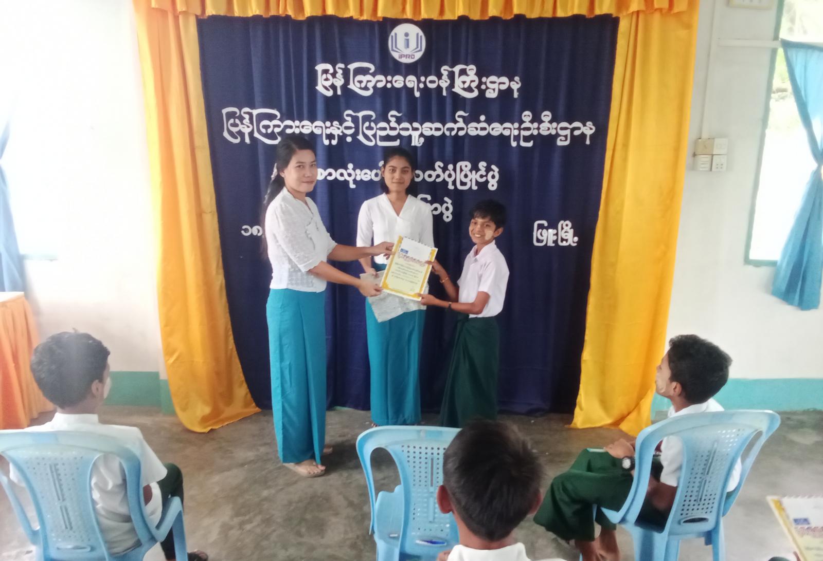 ထို့နောက် အလယ်တန်းအဆင့်ကျောင်းသား၊ ကျောင်းသူ(၁၉)ဦးက စာလုံးပေါင်းသတ်ပုံပြိုင်ပွဲအဖြေမှန်များအားဖြေဆိုကြရာ ပြိုင်ပွဲတွင် ပထမဆု၊ ဒုတိယဆုနှင့် တတိယဆုရရှိသူများအား မြို့နယ်ပြန်ကြားရေးနှင့်ပြည်သူ့ဆက်ဆံရေးဦးစီးမှူး၊ ကျောင်းအုပ်ကြီးနှင့် ဆရာ၊ ဆရာမများက ဂုဏ်ပြုမှတ်တမ်းလွှာများနှင့်ဆုလက် ဆောင်များ ချီးမြှင့်ပေးကြကြောင်းသိရသည်။