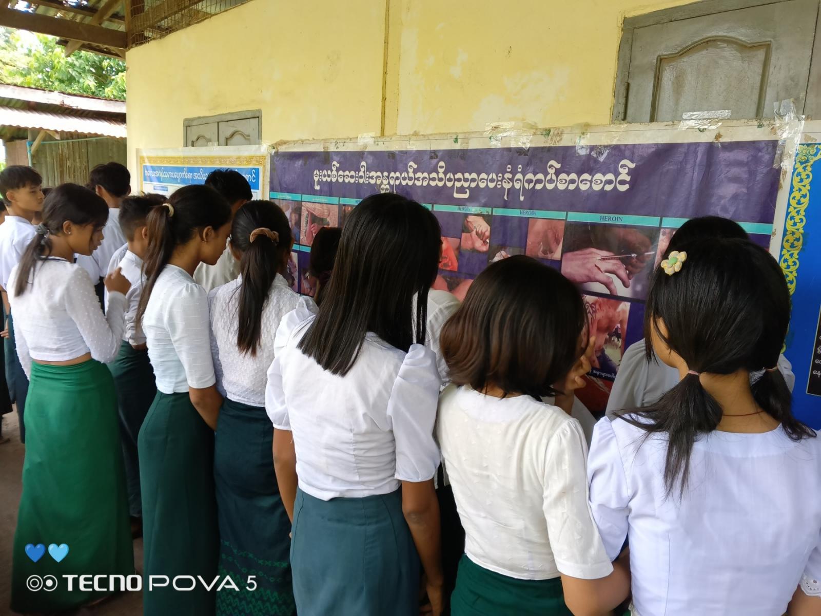 ထို့နောက် ပြန်ကြားရေးနှင့်ပြည်သူ့ဆက်ဆံရေးဦးစီးဌာနမှ စာဖတ်ရှိန်မြှင့်တင်ရေးနယ်လှည့်စာကြည့်တိုက်အဖြစ် ရုပ်သံ-၃ဒေါ်ဖြူဖြူသက်နှင့်ဝန်ထမ်းများက ကျောင်းသား/ကျောင်းသူများအား အသိပညာတိုးပွါးစေမည့် ရုပ်ပုံပြဇာတ်နှင့်ရုပ်ပုံပါပုံပြင်စာအုပ်များဖြင့်ပုံပြင်ပြောပြခြင်း၊ စာအုပ်များအားဖတ်ရှုစေခြင်းနှင့် မူးယစ်ဆေးဝါးအသိပညာပေးနံရံကပ်စာစောင်များကိုပြသခဲ့ရာ ကျောင်းသား/ကျောင်းသူများက စိတ်ပါ၀င်စားစွာကြည့်ရှုလေ့လာကြကြောင်း သိရသည်။