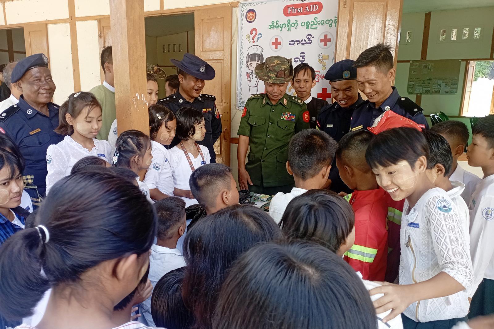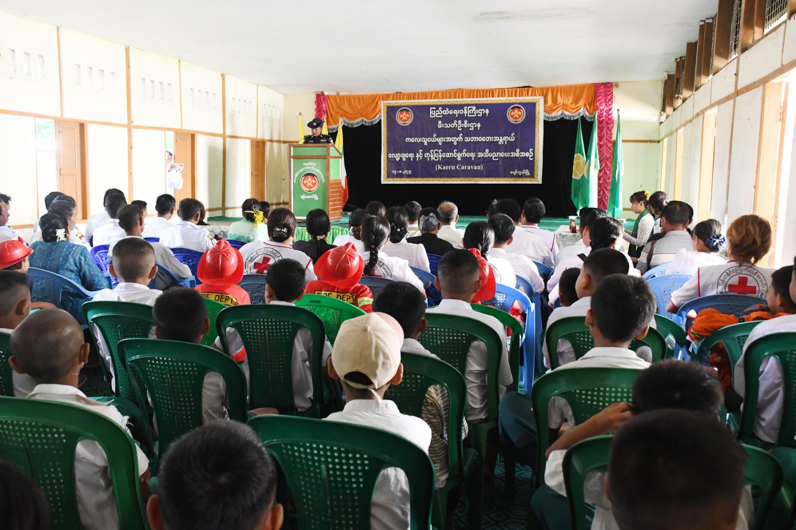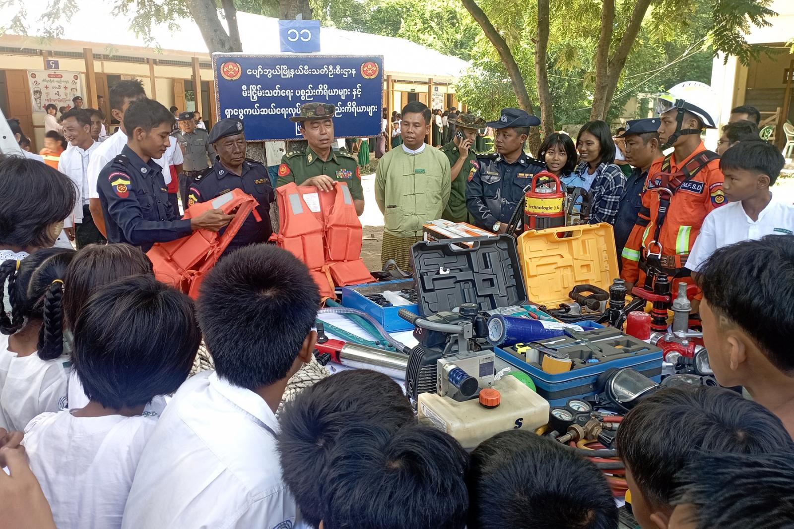 ဆက်လက်၍ မြို့နယ်မီးသတ်ဦးစီးမှူး ဦးကျော်မျိုးက သဘာဝဘေးအန္တရာယ်လျှော့ချရေး အသိပညာ ပေးအစီအစဉ်ရည်ရွယ်ချက်များ၊ မိမိကိုယ်တိုင်နှင့် မိမိပတ်ဝန်းကျင်ကို အကူအညီပေးနိုင်မည့် ဗဟုသုတများကို ရှင်းလင်းဆွေးနွေးပြီး ကျောင်းအုပ်ဆရာမကြီး ဒေါ်မူမူမြင့်က ကျောင်းသား၊ ကျောင်းသူများအနေဖြင့် အစီအစဉ်များတွင် စနစ်တကျလေ့လာသင်ယူနိုင်ရေးတို့ကို ရှင်းလင်း ဆွေးနွေးသည်။