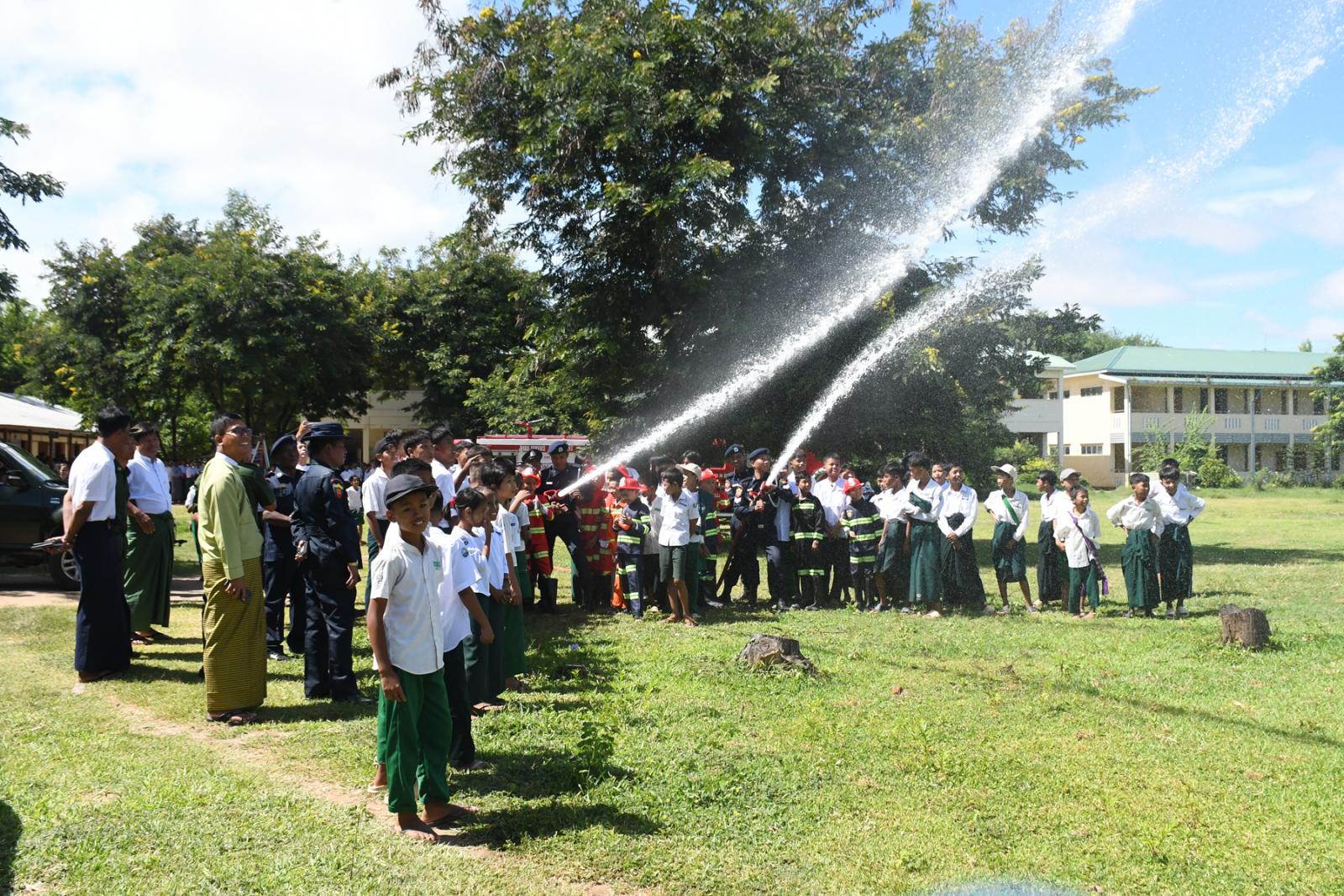 ဆက်လက်၍ မြို့နယ်မီးသတ်ဦးစီးမှူးနှင့်တပ်ဖွဲ့ဝင်များက ကျောင်းသား၊ ကျောင်းသူများအား မီးသတ်ဆေးဘူးအသုံးပြုနည်း၊ မီးငြိမ်းသတ်သည့်ပစ္စည်းများအား မှန်ကန်စွာရွေးချယ်နည်း၊ ရှေးဦးပြုစုနည်းစသည်တို့ကို လက်တွေ့သရုပ်ပြ၊ ရှင်းလင်းဆွေးနွေးရာ ဗိုလ်မှူးကြီးကျော်ဆွေလင်း၊ မြို့နယ်စီမံခန့်ခွဲရေးနှင့်အုပ်ချုပ်ရေးကော်မတီဥက္ကဋ္ဌ ဦးအာကာစိုးနှင့်အဖွဲ့ဝင်များ၊ ခရိုင်မီးသတ်ဦးစီးမှူး ဦးအောင်ခင်ဆင့်နှင့် မြို့နယ်အဆင့်ဌာနဆိုင်ရာများ၊ ဆရာ၊ ဆရာမများ၊ ကျောင်းသားမိဘများက ကြည့်ရှုအားပေးကြကြောင်းသိရသည်။