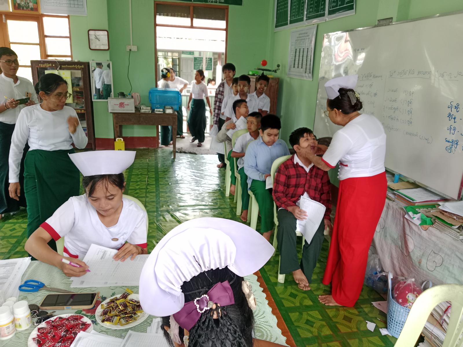 ထို့သို့ ကျောင်းကျန်းမာရေးဆောင်ရွက်ရာတွင် သွားဘက်ဆိုင်ရာ ဒေါက်တာ သင်းနန္ဒာဆွေက သွားတစ်ချောင်းဖွဲ့စည်းတည်ဆောက်ပုံ၊ သွားနှင့် ခံတွင်းဆိုင်ရာ ရောဂါသုံးမျိုးအကြောင်း၊ သွားတိုက်ချိန်နှင့် သွားတိုက်နည်းစနစ် မှန်ကန်စေရေးအကြောင်းအရာများ သွားနှင့် ခံတွင်းအကြောင်း၊ မှန်ကန်စွာသွားတိုက်နည်းစနစ်အကြောင်း ဟောပြောခြင်းများ ဆောင်ရွက်ခဲ့ပြီး သွားစစ်ဆေးပေးခြင်း၊ ဖာထေးပေးခြင်း၊ နုတ်ပေးခြင်းတို့ကို ဆောင်ရွက်ပေးခဲ့ကြောင်း သိရသည်။