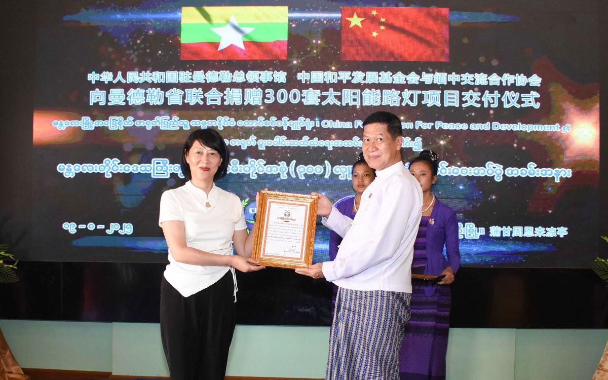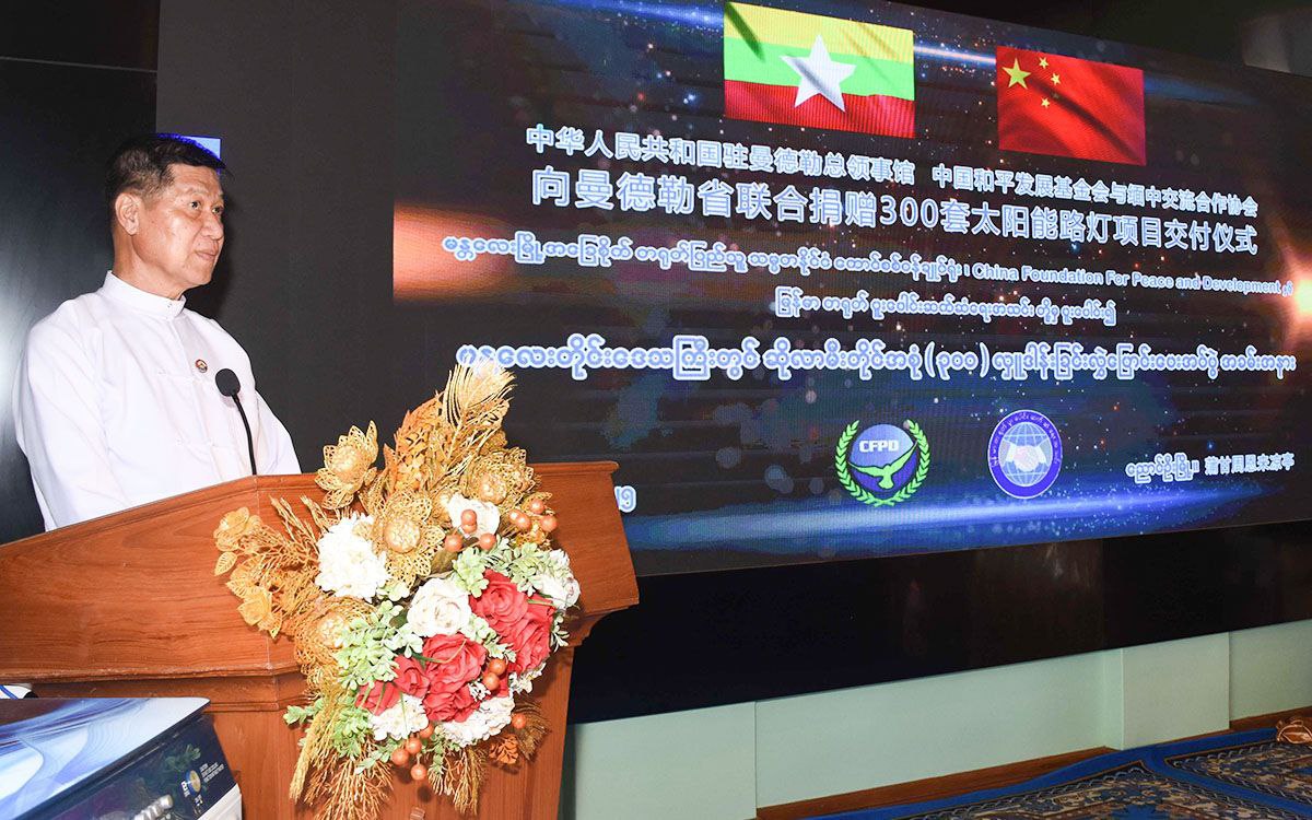 မြန်မာ-တရုတ် နှစ်နိုင်ငံသံတမန်ဆက်ဆံရေးထူထောင်ခြင်း (၇၅)နှစ်ပြည့်အထိမ်းအမှတ်အဖြစ် မန္တလေးမြို့အခြေစိုက် တရုတ်ပြည်သူ့သမ္မတနိုင်ငံ ကောင်စစ်ဝန်ချုပ်ရုံး၊ China Foundation for Peace and Development နှင့် မြန်မာ-တရုတ်ပူးပေါင်းဆက်ဆံရေးအသင်းတို့ ပူးပေါင်း၍ မန္တလေးတိုင်း ဒေသကြီးအတွက် အမေရိကန်ဒေါ်လာ ၈၂၀၀၀ ခန့်တန်ဖိုးရှိ ဆိုလာမီးတိုင် အစုံ(၃၀၀) လှူဒါန်းပွဲအခမ်းအနားကို ယနေ့နံနက်ပိုင်းက ညောင်ဦးမြို့ ရွှေစည်းခုံစေတီတော်ပရိဝုဏ်အပြင်ဘက် ချူအင်လိုင်းတန်စောင်း အခမဲ့တည်းခိုဆောင်အမှတ်(၃)တွင်ကျင်းပသည်။