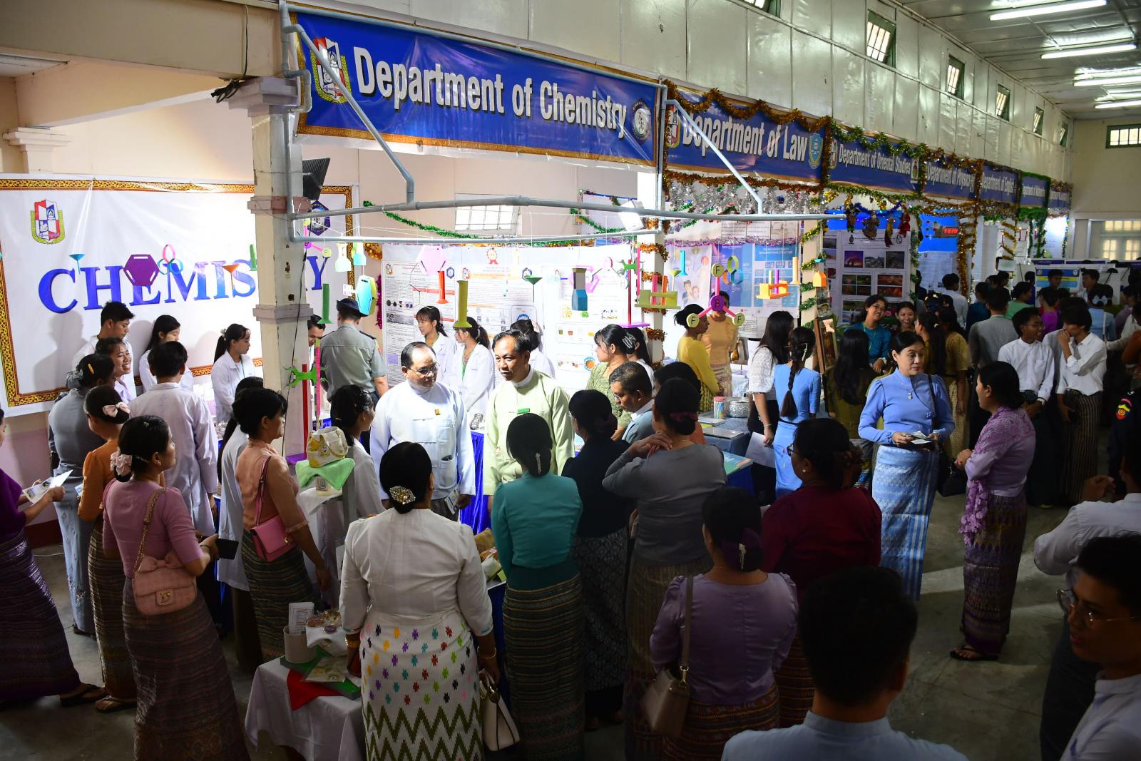ဆက်လက်၍မြန်မာ၊ အင်္ဂလိပ်စာ၊ သင်္ချာ၊ ရူပဗေဒ၊ ရုက္ခဗေဒ၊ သမိုင်း၊ အရှေ့တိုင်းပညာ၊ ဘူမိဗေဒ၊ ဒဿနိကဗေဒစသည့်ဘာသာရပ် ၁၄ ခုမှ ပြသပြိုင်ပွဲဝင်ထားသည့် သုတေသနပြခန်းများကို ပါမောက္ခချုပ်ဒေါက်တာဘဟန်၊ ခရိုင်စီမံအုပ်ချုပ်ရေးကော်မတီဥက္ကဋ္ဌ ဦးအောင်မြင့်ဦးနှင့် တာဝန်ရှိသူများက လှည့်လည်ကြည့်ရှုအားပေးသည်။