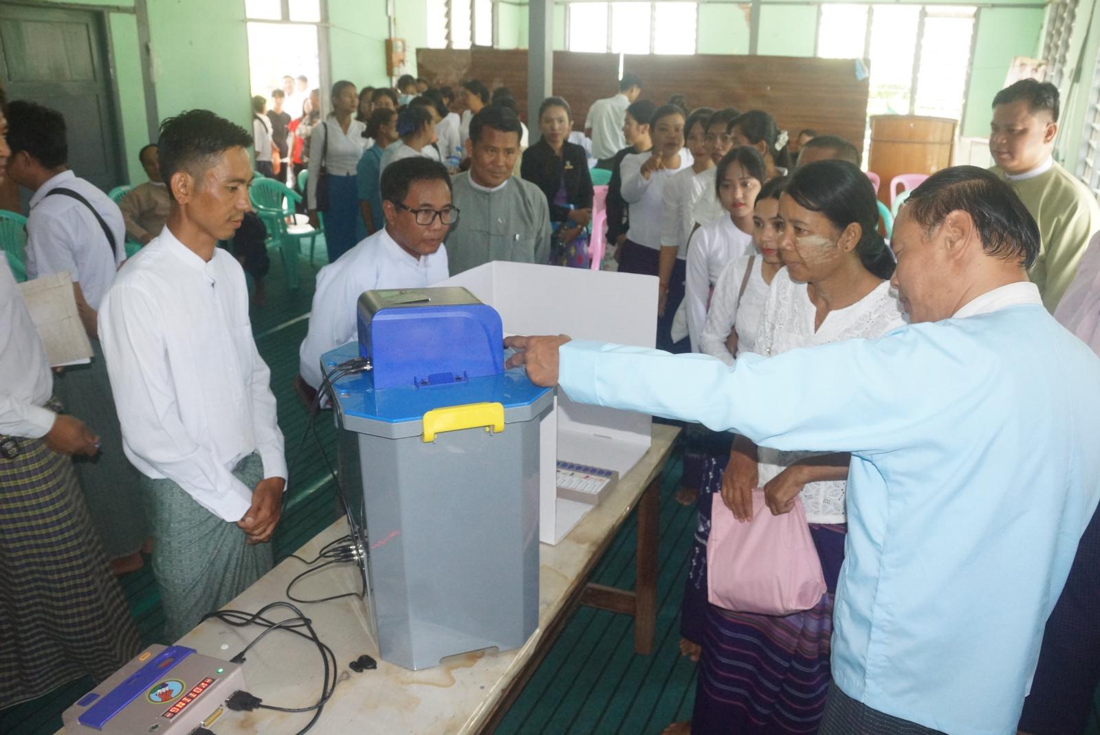 ဆက်လက်၍ မြို့နယ်ရွေးကောက်ပွဲကော်မရှင်အဖွဲ့ခွဲ အတွင်းရေးမှူး ဦးရဲမင်းလွင်က မဲဆန္ဒရှင်များအား မြန်မာအီလက်ထရော နစ်မဲပေးစက်(MEVM) ဖြင့် သုံးစွဲပုံအဆင့်ဆင့်များကို ရှင်းလင်းပြောကြားပြီးနောက် မဲပေးစက်ဖွဲ့စည်းတည်ဆောက်ပုံ၊ အီလက်ထရောနစ်မဲပေးစက်များတပ်ဆင်ပုံ၊ မဲပေးချိန်နှင့် မဲရေတွက်ချိန်တို့တွင် ထိန်းချုပ်စက်ကိုင်တွယ်အသုံးပြုပုံ နည်းစနစ်များကို ရှင်းလင်းပြသရာ တက်ရောက်လာသူများက မြန်မာအီလက်ထရောနစ်မဲပေးစက်ဖြင့် ကိုယ်တိုင်စမ်းသပ်မဲပေးခြင်းများကို လက်တွေ့ဆောင်ရွက်ခဲ့ကြသည်။