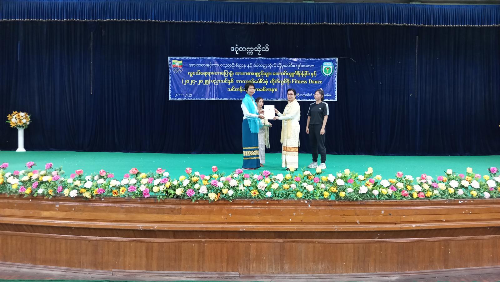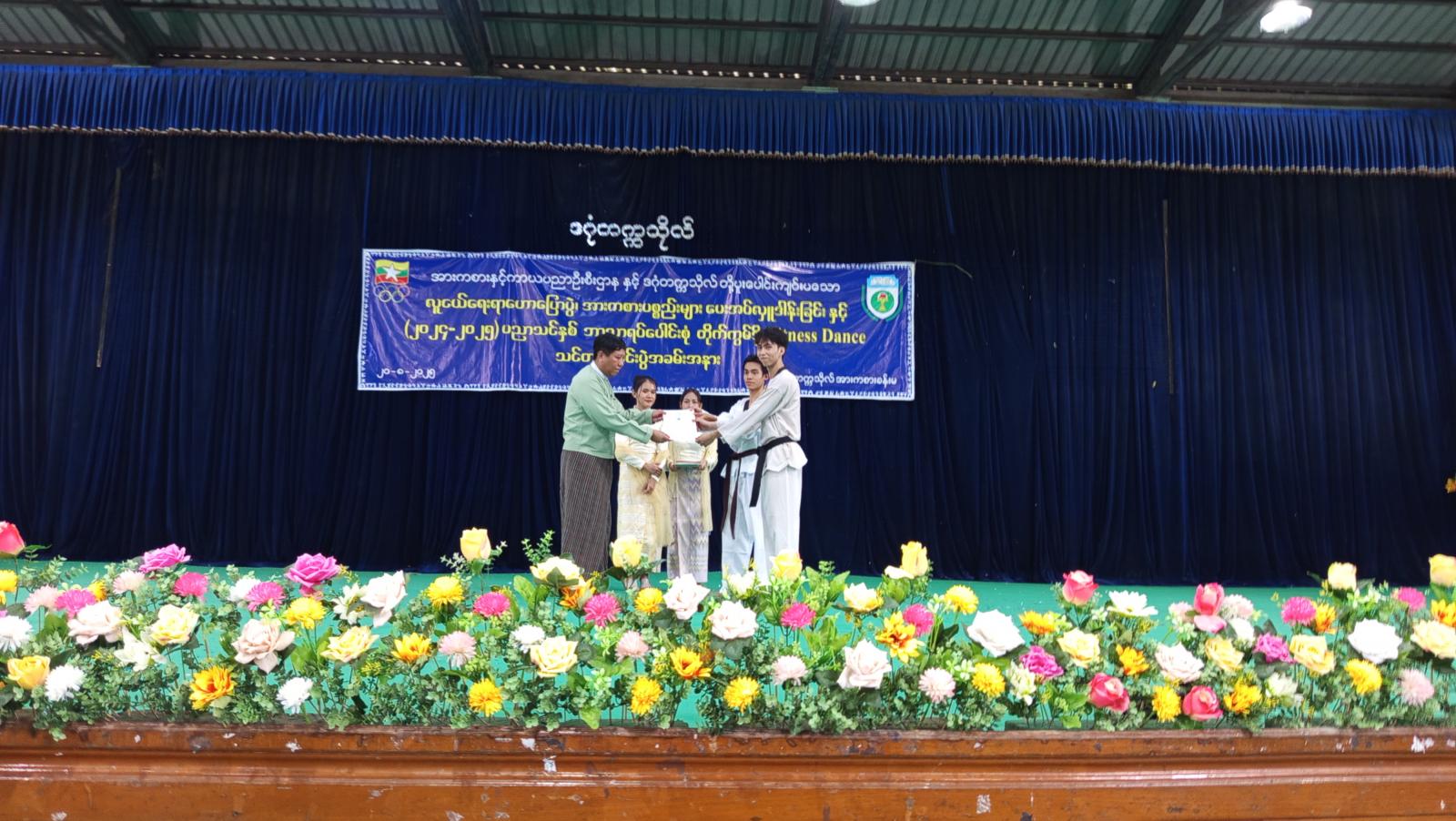 ဆက်လက်၍ တိုက်ကွမ်ဒို၊ Fitness Dance သင်တန်းသား၊ သင်တန်းသူများက သရုပ်ပြသခဲ့ပြီး မြို့နယ်အားကစားနှင့်ကာယပညာဦးစီးဌာနမှ အားကစားမှူးက အားကစားပစ္စည်းများကို ပေးအပ်ရာ ပါမောက္ခချုပ်မှ လက်ခံရယူခဲ့သည်။