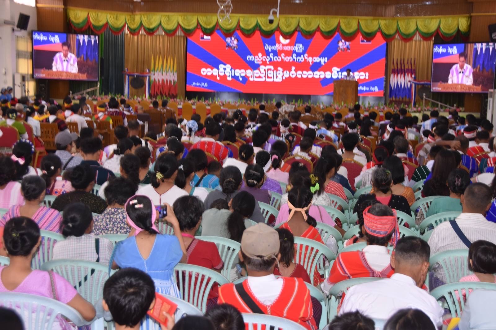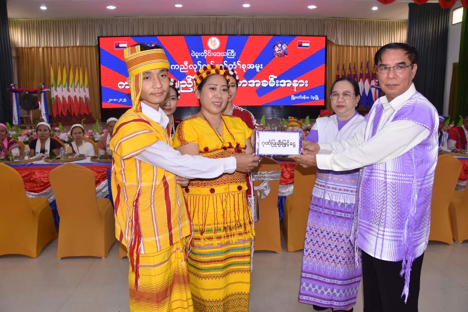 ယင်းနောက် ကရင်တိုင်းရင်းသားစာပေနှင့် ယဉ်ကျေးမှုကော်မတီအဖွဲ့ဝင်တစ်ဦးက ကျေးဇူးတင်စကားပြန်လည်ပြောကြားခဲ့ပြီး တိုင်းဒေသကြီး ဝန်ကြီးချုပ်နှင့် ဇနီး၊ တရားလွတ်တော်တရားသူကြီးချုပ်၊ အစိုးရအဖွဲ့ဝင် ဝန်ကြီးများနှင့် ၎င်းတို့၏ ဇနီးများ၊ ဌာနဆိုင်ရာများအား သတ်မှတ်နေရာအသီးသီး၌ ချည်ဖြူဖွဲ့ မင်္ဂလာကျင်းပပေးခဲ့ပြီး တက်ရောက်လာသည့် ဧည့်သည်တော်များအား နေ့လယ်စာဖြင့် တည်ခင်းဧည့်ခံကျွေးမွေးခဲ့ကြောင်း သိရှိရသည်။