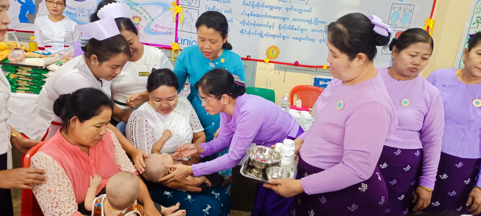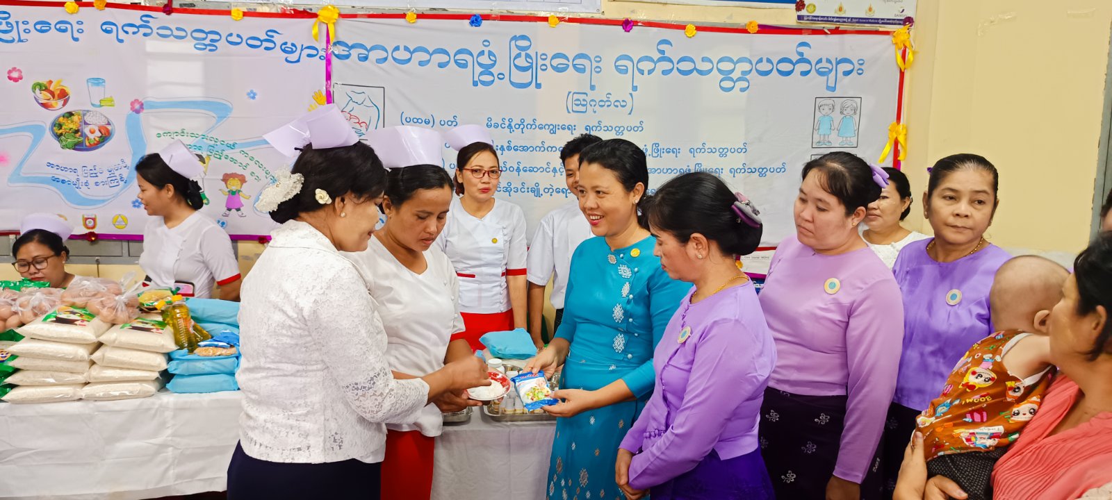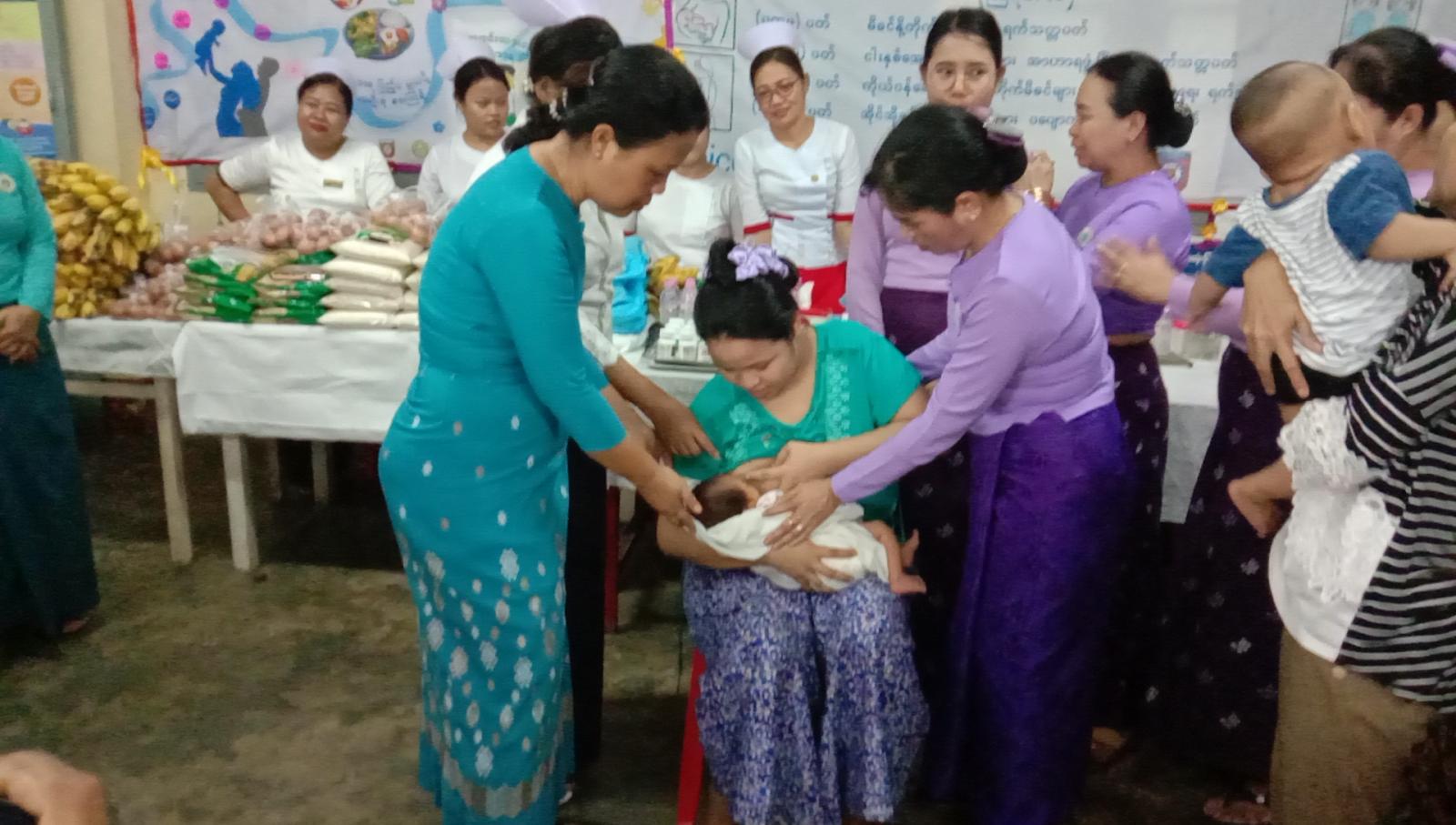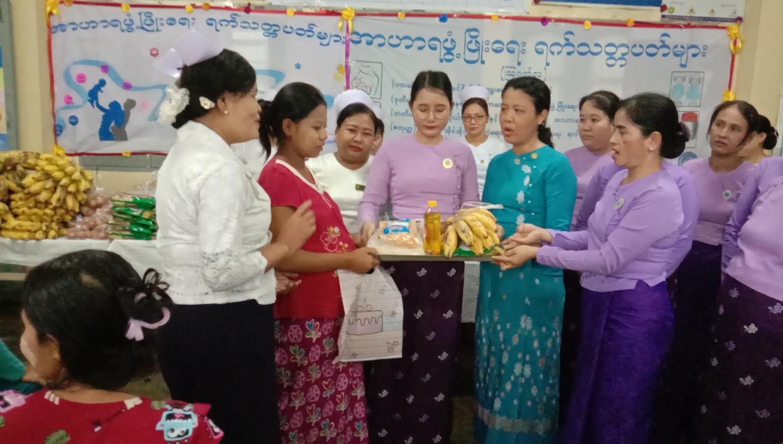 ရှေးဦးစွာ ကိုယ်ဝန်ဆောင်များအနေဖြင့် ခန္ဓာကိုယ်အတွက်သာမက မွေးဖွားလာမည့်ရင်သွေးငယ်များအတွက်အာဟာရပြည့်ဝစေရေး၊ သွေးအားကောင်းစေရေး၊ အိုင်အိုဒင်းဆားစားသုံးမှုနှင့် အစာအာဟာရရွေးချယ်စားသောက်ရေး စသည့်ကျန်းမာရေးဆိုင်ရာများကို မြို့နယ်ပြည်သူ့ကျန်းမာရေးဦးစီးဌာနမှူး ဒေါက်တာကြူကြသင်းမှအသိပညာပေးဟောပြောသည်။ ဆက်လက်၍ မြို့နယ်မိခင်နှင့်ကလေးစောင့်ရှောက်ရေးအသင်းဥက္ကဋ္ဌဒေါ်သူဇာသိမ့်နှင့်အဖွဲ့ဝင်များ နို့တိုက်မိခင်များကို စနစ်တကျနို့ချိုတိုက်ကျွေးနည်းများအားသင်ကြားလေ့ကျင့်ပေးခြင်း၊ နှစ်နှစ်အောက်ကလေးငယ်များအား(vitamin A) ဗီတာမင်အေများတိုက်ကျွေးပြီး မြို့နယ် အမျိုးသမီးရေးရာအဖွဲ့ဝင်များက ကိုယ်ဝန်ဆောင်မိခင်နှင့်နို့တိုက်မိခင်များအား အာဟာရရက် သတ္တပတ်လှုပ်ရှားမှုအနေဖြင့် အာဟာအုပ်စ(၅)စုပစ္စည်းများအား ထောက်ပံ့ပေးဝေလျက်ရှိသည်။