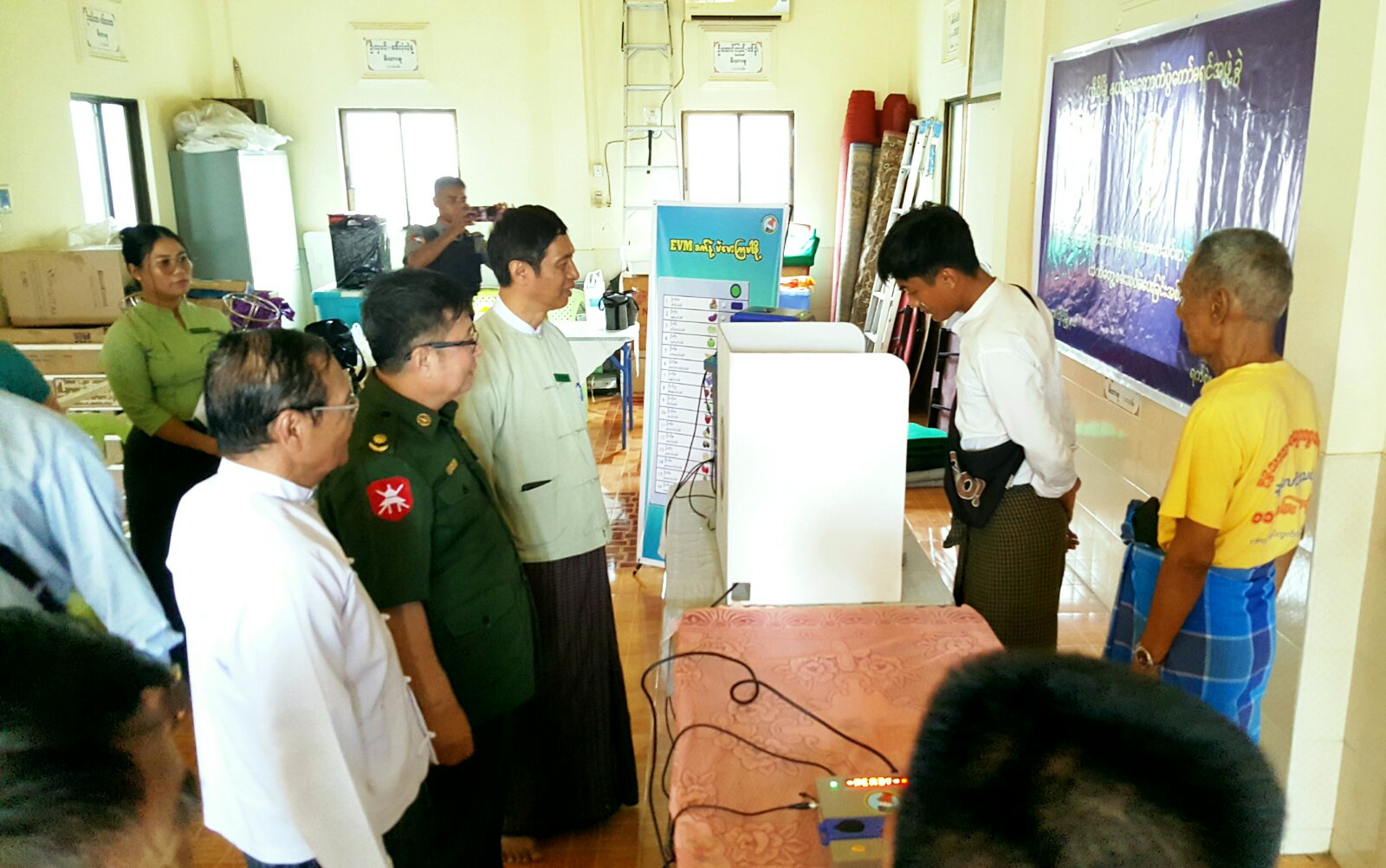 ရန်ကုန်တိုင်းဒေသကြီး၊ မရမ်းကုန်းခရိုင်၊ လှိုင်မြို့နယ်၌ မြန်မာအီလက်ထရောနစ်မဲပေးစက် MEVM ဆိုင်ရာ အသိပညာပေးခြင်းနှင့် လက်တွေ့စမ်းသပ်မဲပေးခြင်းအခမ်းအနားကို ဩဂုတ် ၂၀ ရက် နံနက် ၁၀ နာရီအချိန်က အမှတ်(၃)ရပ်ကွက်၊ (၁၁)လမ်းဓမ္မာရုံတွင် ကျင်းပခဲ့သည်။