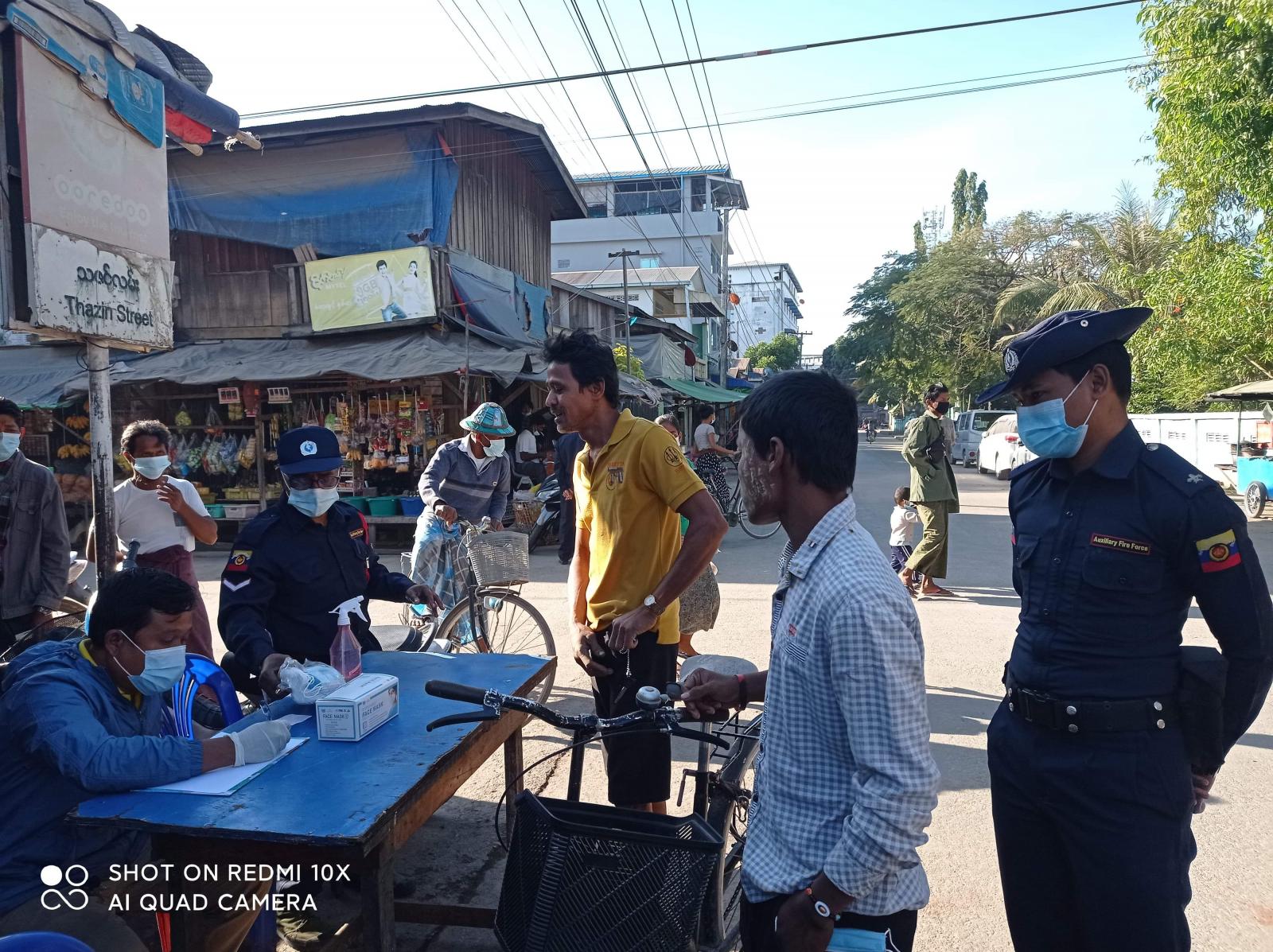 ထိုသို့ ဆောင်ရွက်ရာတွင် မြို့နယ်အရန်မီးသတ်တပ်ဖွဲ့ဝင်များ၊ ရပ်ကွက်အုပ်ချုပ်ရေးမှူးနှင့် ဆယ်အိမ်မှူးရာ အိမ်မှူးတို့ ပူးပေါင်း၍ ကိုဗစ်-၁၉ ရောဂါကြိုတင်ကာကွယ်ရေးအတွက် နှာခေါင်းစည်း တပ်ဆင်ခြင်းမရှိသည့် နေအိမ်ပြင်ပသို့ ထွက်ခွာသွား လာနေကြသည့် ပြည်သူများအား နှာခေါင်းစည်းတစ်ခုကို ငွေကျပ် ငါးဆယ်နှင့် ဒဏ်ကြေးငွေ ၁၅၀ ကျပ် စုစုပေါင်းငွေကျပ် ၂၀၀ ကျပ်နှုန်းဖြင့်ချက်ချင်း ဝယ်ယူတပ်ဆင်စေခဲ့ပြီး ကျန်းမာရေးနှင့် အားကစားဝန်ကြီးဌာနမှ ထုတ်ပြန်ထားသော စည်းကမ်းချက်များ နှင့်အညီ လိုက်နာ ဆောင်ရွက်သွားရန် အသိပညာပေးပြောကြားခဲ့ကြောင်း သိရသည်။