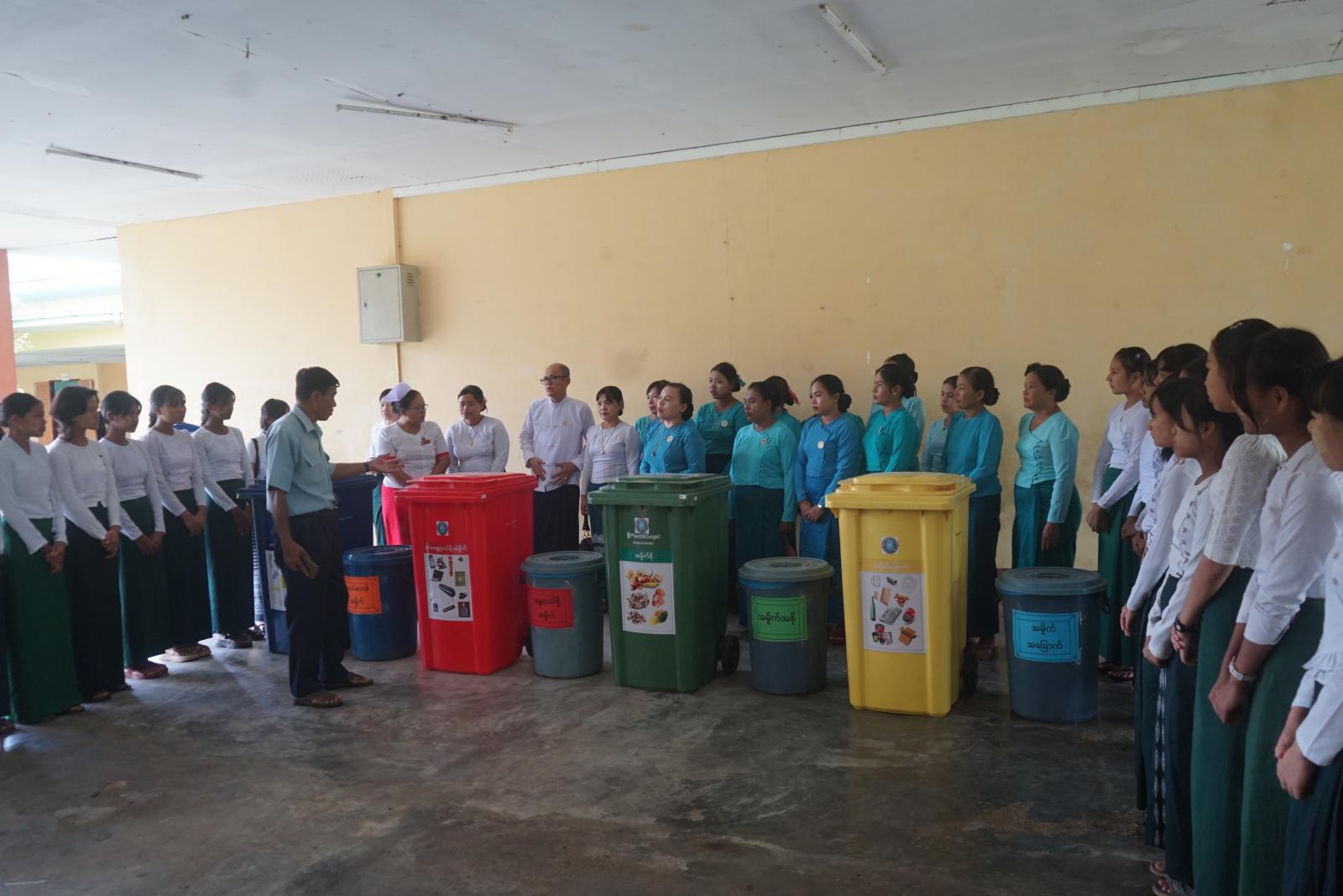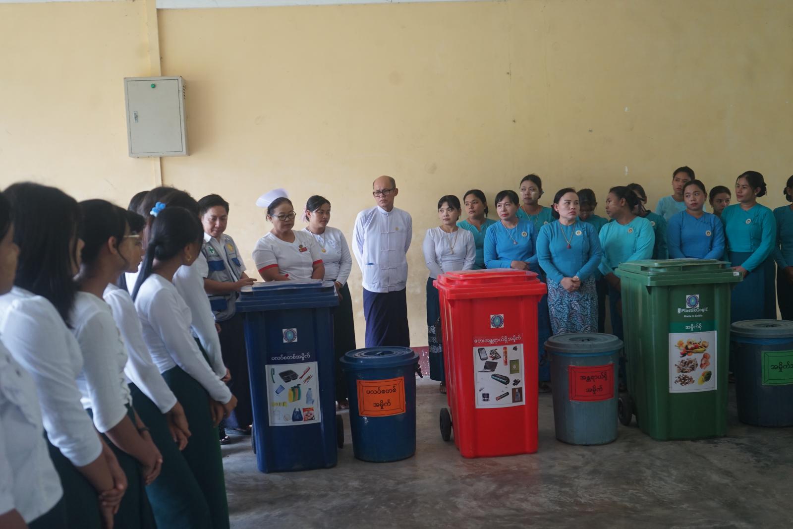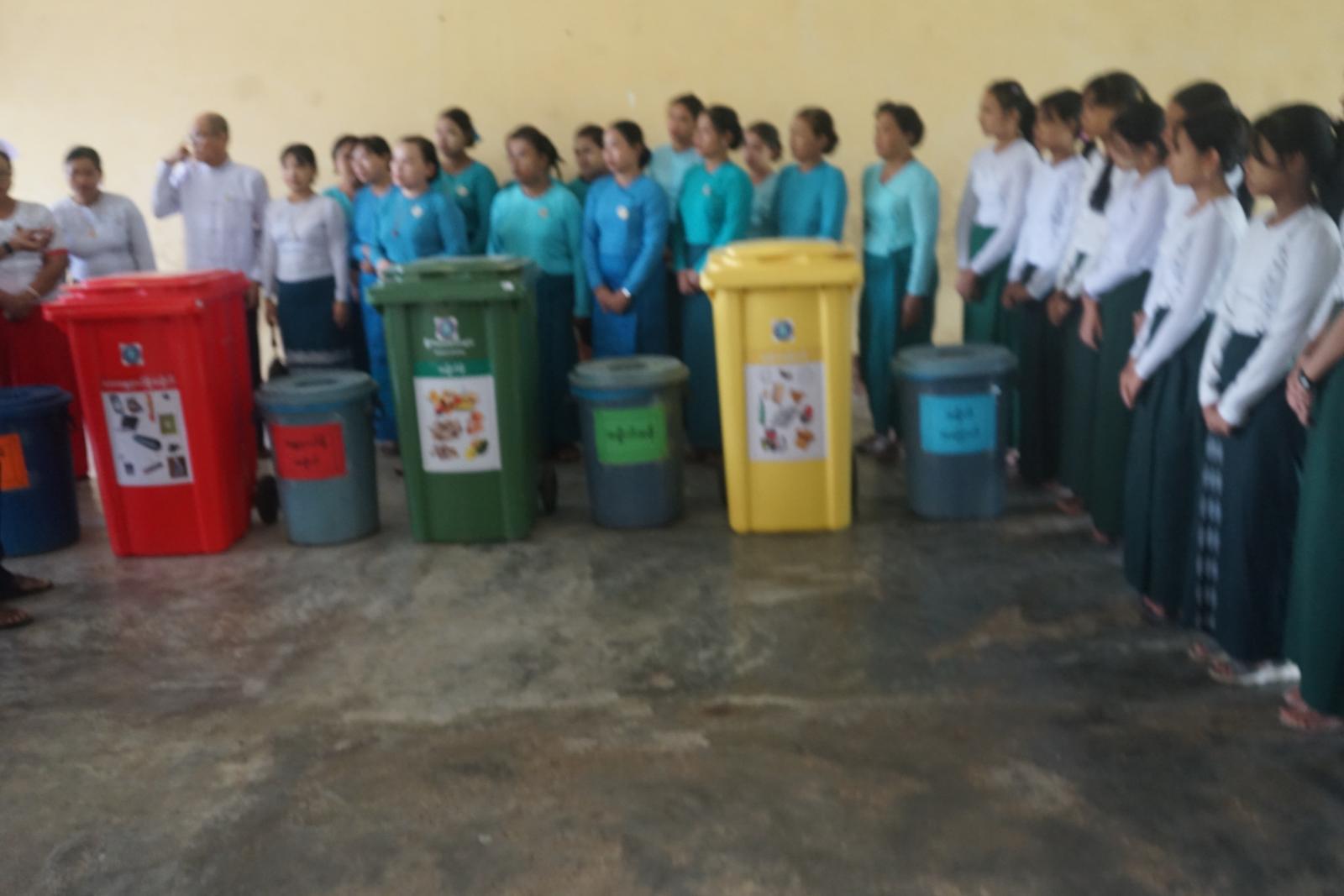 ဟောပြောရာတွင် မြို့နယ်စည်ပင်သာယာရေးအဖွဲ့မှ လက်ထောက်ညွှန်ကြားရေးမှူး ဦးတင်ထွန်းအောင်က ပြောကြားရာတွင် ခြောက်သွေ့သောစက္ကူ၊ ကတ်ထူစက္ကူ၊ သံတိုသံစ၊ ပိတ်စ၊ သစ်သားစတဲ့ စွန့်ပစ်ပစ္စည်းတွေကို အမှိုက်ခြောက်အဖြစ် သတ်မှတ်ထားသဖြင့် အဝါရောင်အမှိုက်ပုံးတွင် စွန့်ပစ်ကြရန်၊ အမှိုက်စိုက မီးဖိုချောင်ထွက်ပစ္စည်းများ၊ တစ်ကိုယ်ရေသုံး သန့်ရှင်းရေးပစ္စည်းတွေကို စွန့်ပစ်ဖို့အတွက် အစိမ်းရောင်အမှိုက်ပုံးဖြစ်ကြောင်း၊ ပလတ်စတစ်အမှိုက်အတွက်ကတော့ အပြာရောင်အမှိုကပုံးဖြစ်ကြောင်း၊ လျှပ်စစ်နဲ့ ဓာတုဆိုင်ရာဘေးအန္တရာယ်ပစ္စည်းများကို အနီရောင်အမှိုက်ပုံတွင် စွန့်ပစ်ကြရန် အမှိုက်အမျိုးအစားအလိုက် ဝါ၊ စိမ်း၊ နီ၊ ပြာ၊ ခွဲပြီး အမှိုက်မျာ စနစ်တကျစွန့်ပစ်ကြရန် ပြောကြားခဲ့သည်။