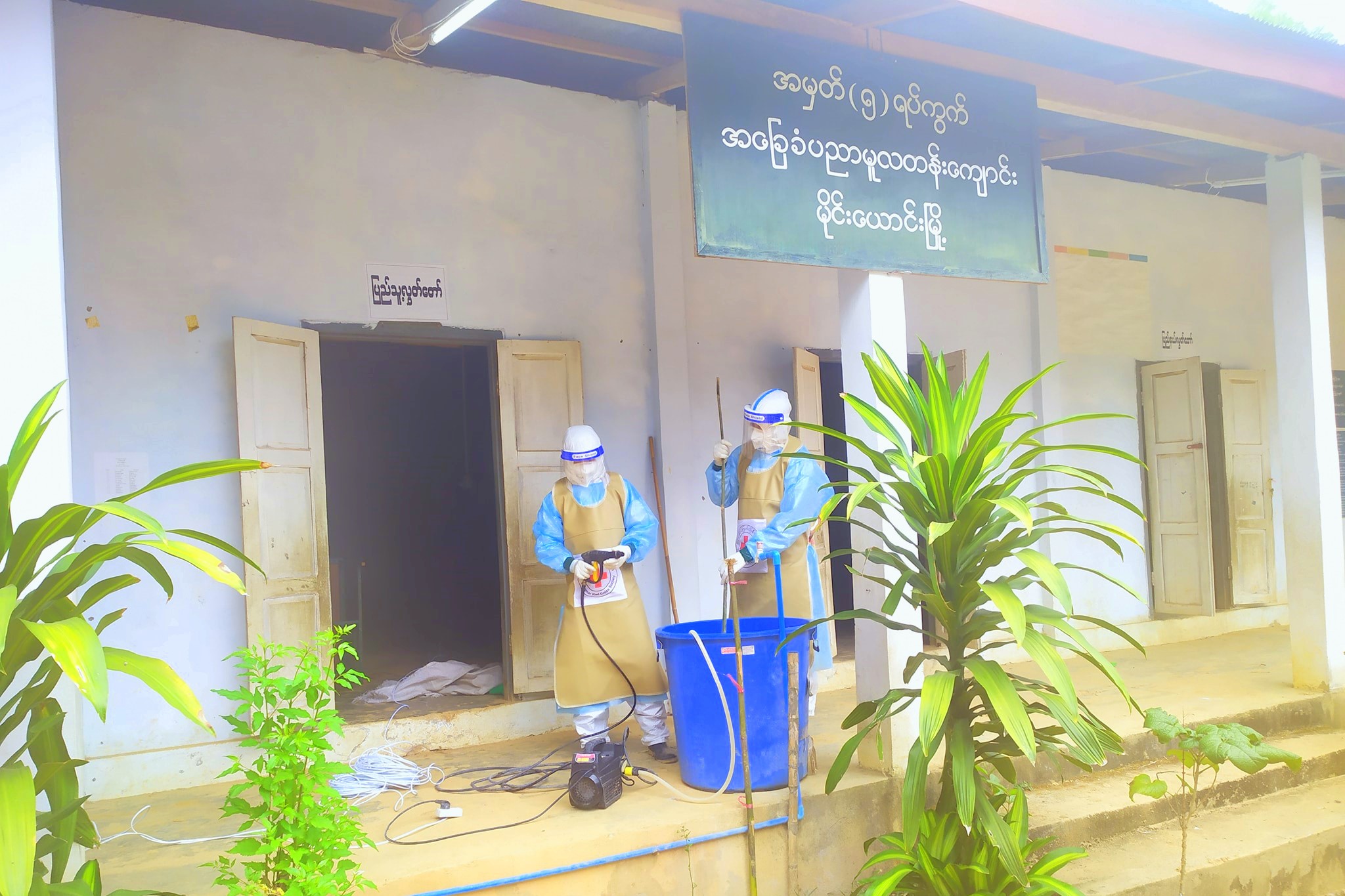 မိုင်းယောင်းမြို့နယ် ကြက်ခြေနီသူနာပြုတပ်ဖွဲ့သည် ကိုဗစ်-၁၉ ရောဂါ ကာကွယ်ရေးလုပ်ငန်းများကို အဓိကဆောင်ရွက်နေသော ကျန်းမာရေးနှင့်အတူ အားကြိုးမာန်တက် ပူးပေါင်းဆောင်ရွက်နေပြီး ပိုးတွေ့လူနာ မိသားစုနေထိုင်ရာ နေအိမ်ခြံဝန်းများ၊ Quarantine center များအဖြစ် အသုံးပြုပြီးသည့် အသွားအလာ ကန့်သတ်စောင့်ကြည့်စခန်းများနှင့် တည်းခိုခန်းများရှိ အိပ်ဆောင်များ၊ ရေအိမ်၊ ရေချိုးခန်းများကို ပိုးသတ်ဆေးဖျန်းခဲ့သည်။