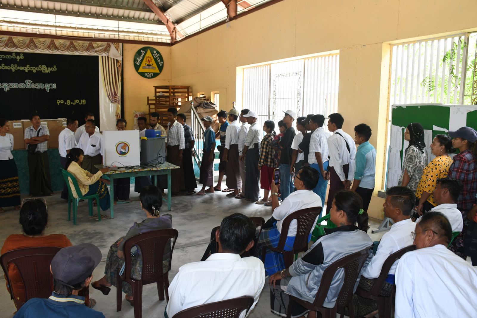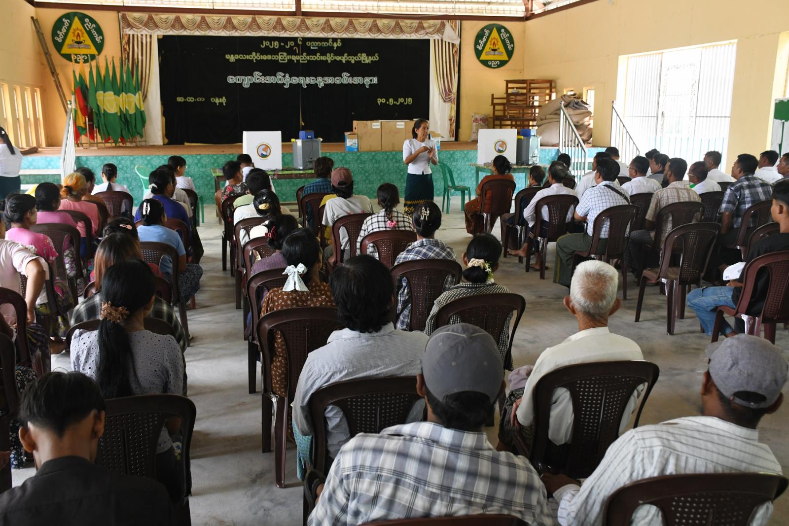 ရှေးဦးစွာ မြို့နယ်ရွေးကောက်ပွဲကော်မရှင်အဖွဲ့ခွဲရုံးမှ မြို့နယ်ရွေးကောက်ပွဲအရာရှိ ဒေါ်ခင်သီတာခိုင်က မြန်မာအီလက်ထရောနစ်မဲပေးစက်(MEVM)အကြောင်းနှင့် မဲပေးပုံအဆင့်ဆင့်တို့ကို ရှင်းလင်းဆွေးနွေးသည်။