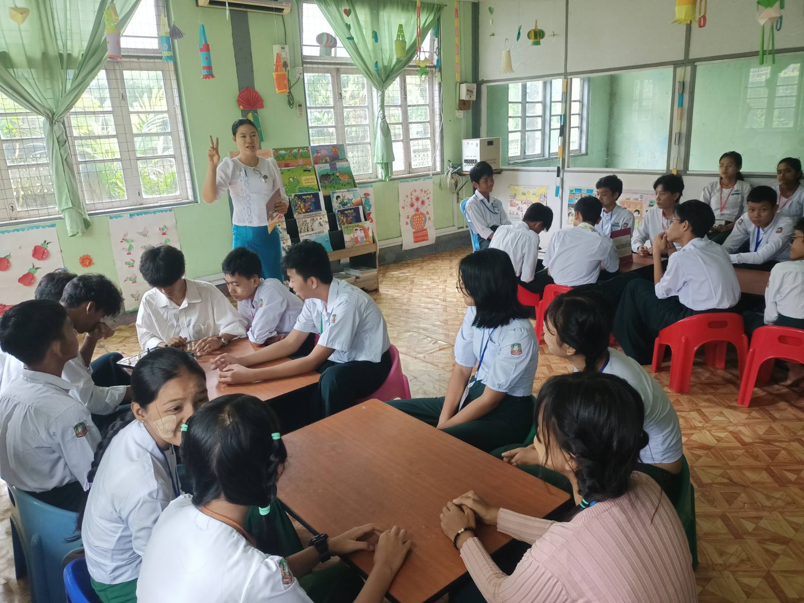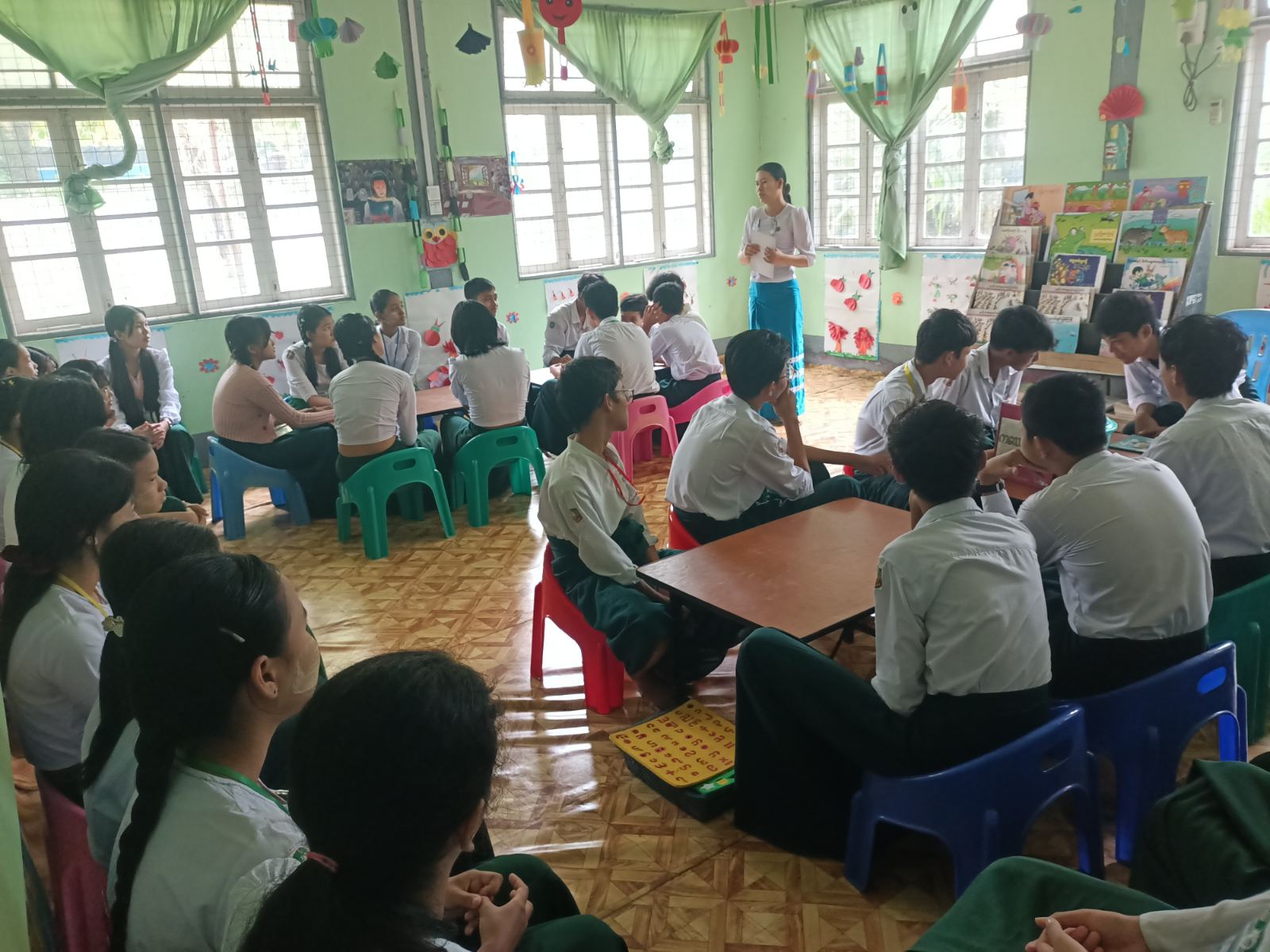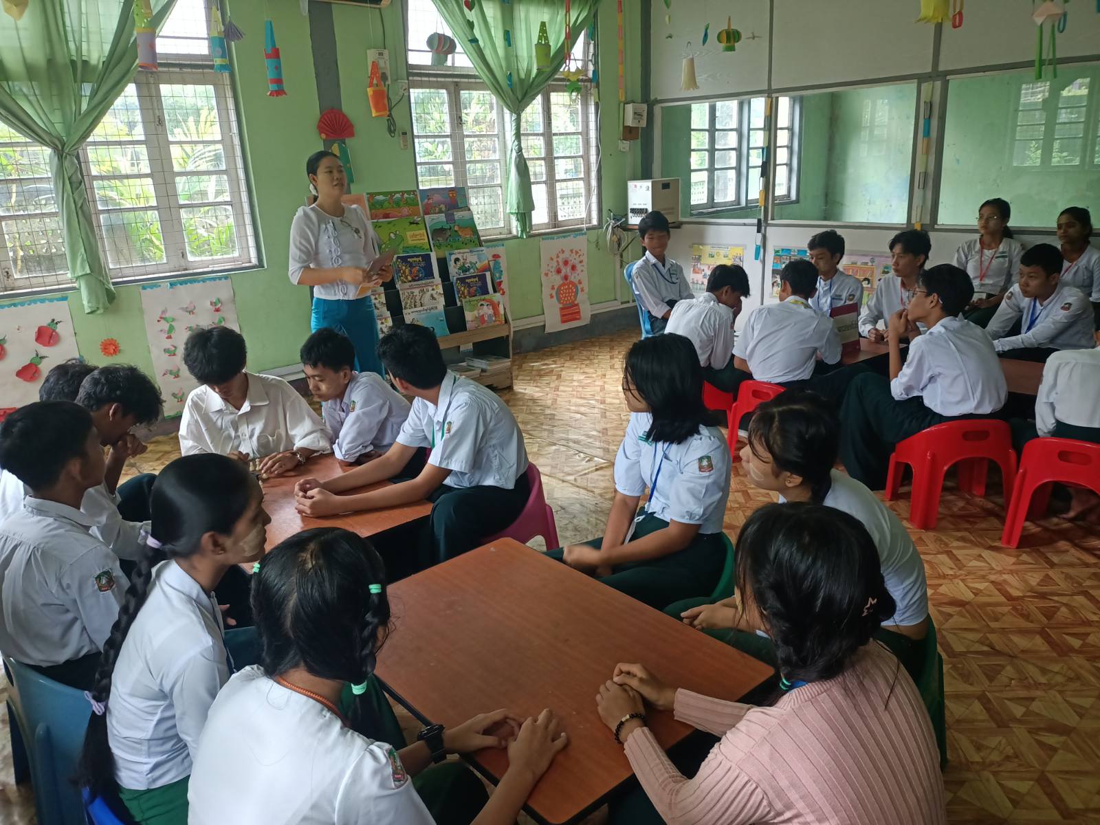 ထို့သို့ ဆောင်ရွက်ရာတွင် သန်လျင်ခရိုင် ပြန်ကြားရေးနှင့်ပြည်သူ့ဆက်ဆံရေးဦးစီးဌာနမှ ဒုတိယဦးစီးမှူး ဒေါ်စမ်းစမ်းစိမ့်က ကျောင်းသား၊ ကျောင်းသူများ အကျင့်စာရိတ္တကောင်းမွန်စေရန်၊ ပြည်သူ့စာကြည့်တိုက်နှင့် ရင်းနှီးမှုရှိစေရန်စာကြည့်တိုက်မှ အသိပညာဗဟုသုတများ ရရှိသည့်နေရာဖြစ်ပါကြောင်း ပြောကြားပြီး ကျောင်းသား၊ ကျောင်းသူများအား "ကလေးတို့အတွက် မြန်မာစကားပုံများ" ခေါင်းစဉ်စာအုပ်ဖြင့် ဖတ်ရှုပြောပြခဲ့သည်။