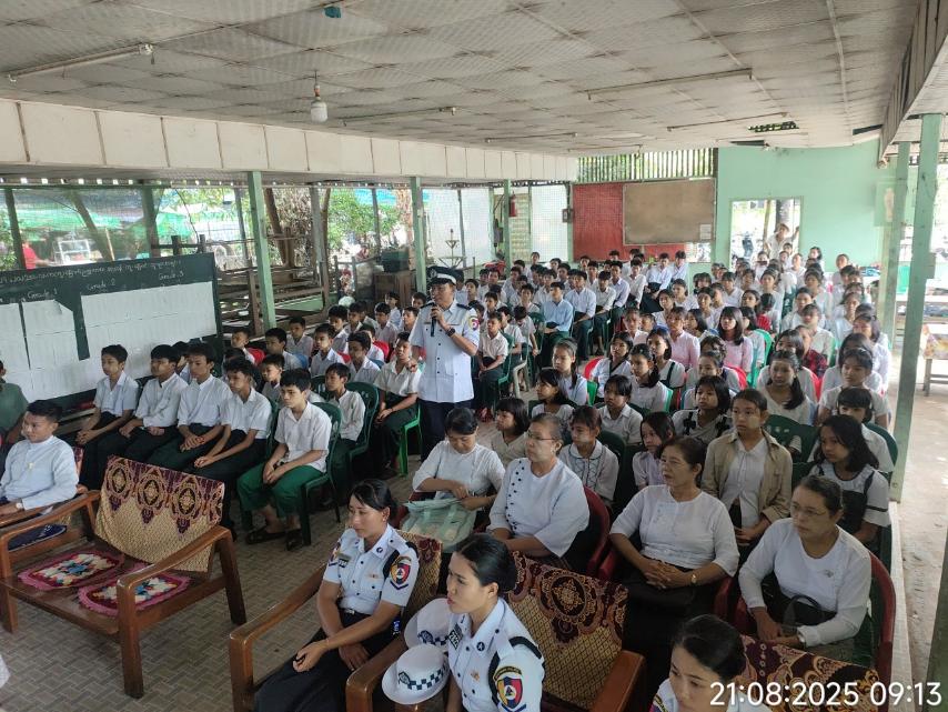 ထိုသို့ ဆောင်ရွက်ရာတွင် အမှတ်(၃၅)ယာဥ်ထိန်းတပ်ဖွဲ့စုမှ မြို့နယ်တပ်စုမှူး ဒုတိယရဲမှူး လှိုင်ဝင်းအောင်က ကျောင်းသား၊ ကျောင်းသူများအနေဖြင့် လမ်းဖြတ်ကူးရာတွင် လိုက်နာရမည့်စည်းကမ်းများ၊ ခြေကျင်လမ်းလျှောက်သူများ လိုက်နာရမည့်စည်းကမ်းများ၊ အုပ်စုလိုက် အစုအဝေးဖြင့်လျှောက်သူများ လမ်းလျှောက်သူများ လိုက်နာရမည့်စည်းကမ်းများ၊ အနှေးယာဉ်စီးနင်းသူများ လိုင်နာရမည့်စည်းကမ်း စသည့် အသိပညာဗဟုသုတများအား ကျောင်းသား၊ ကျောင်းသူများ သိရှိလိုက်နာနိုင်ရေး အသိပညာပေးဟောပြောပေးခဲ့ပြီး ယာဉ်စည်းကမ်း၊ လမ်းစည်းကမ်း အသိပညာပေးလက်ကမ်းစာစောင်များကိုလည်း ဖြန့်ဝေပေးခဲ့ကြရာ ကျောင်းအုပ်ဆရာကြီးက ကျေးဇူးတင်စကားပြန်လည်ပြောကြားခဲ့သည်။