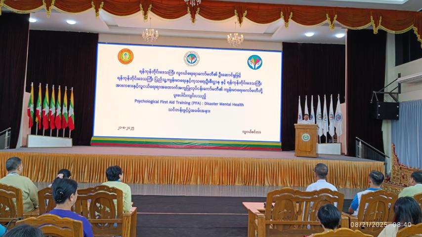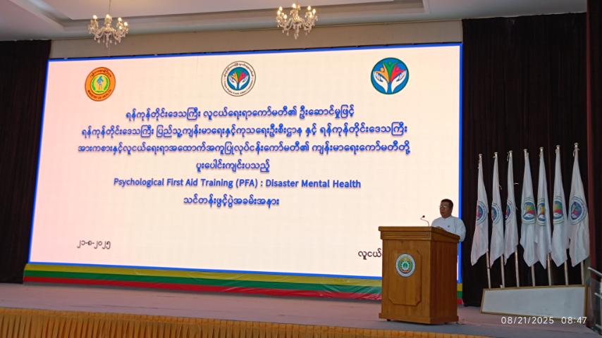 ရန်ကုန်တိုင်းဒေသကြီး၊ ဗိုလ်တထောင်ခရိုင်၊ သာကေတမြို့နယ် (၉)ရပ်ကွက်အတွင်း ရှုခင်းသာလမ်းရှိ ရန်ကုန်တိုင်းဒေသကြီး လူငယ်ရေးရာကော်မတီ၏ ဦးဆောင်မှုဖြင့် ရန်ကုန်တိုင်းဒေသကြီး ပြည်သူ့ကျန်းမာရေးနှင့် ကုသရေးဦးစီးဌာနနှင့် ရန်ကုန်တိုင်းဒေသကြီး အားကစားနှင့်လူငယ်ရေးရာထောက်အကူပြုလုပ်ငန်းကော်မတီ၊ ကျန်းမာရေးကော်မတီတို့ ပူးပေါင်းကျင်းပသည့် Psychological First Aid Training (PFA): Disaster Mental Health သင်တန်းဖွင့်ပွဲအခမ်းအနားကို ယမန်နေ့နံနက်ပိုင်းက ကျင်းပပြုလုပ်ခဲ့ကြသည်။