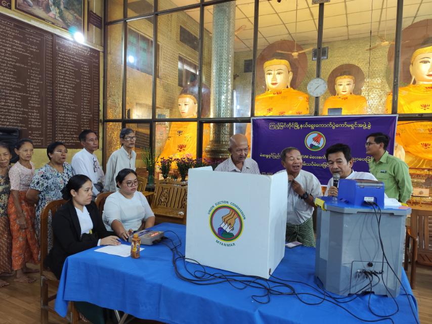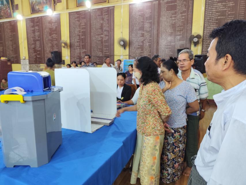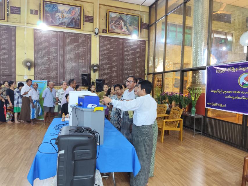 ရန်ကုန်တိုင်းဒေသကြီး၊ အလုံခရိုင်၊ ကြည့်မြင်တိုင်မြို့နယ်၌ မြန်မာအီလက်ထရောနစ်မဲပေးစက် (MEVM) ဆိုင်ရာ အသိပညာပေးခြင်းနှင့် လက်တွေ့စမ်းသပ်မဲပေးခြင်း သရုပ်ပြပွဲဆောင်ရွက်ခြင်းကို ယမန်နေ့ နေ့လယ်(၁)နာရီအချိန်က မကျည်းတန်းမြောက် အရှေ့ရပ်ကွက်၊ ဘုရားငါးဆူဓမ္မာရုံ၌ ကျင်းပပြုလုပ်သည်။