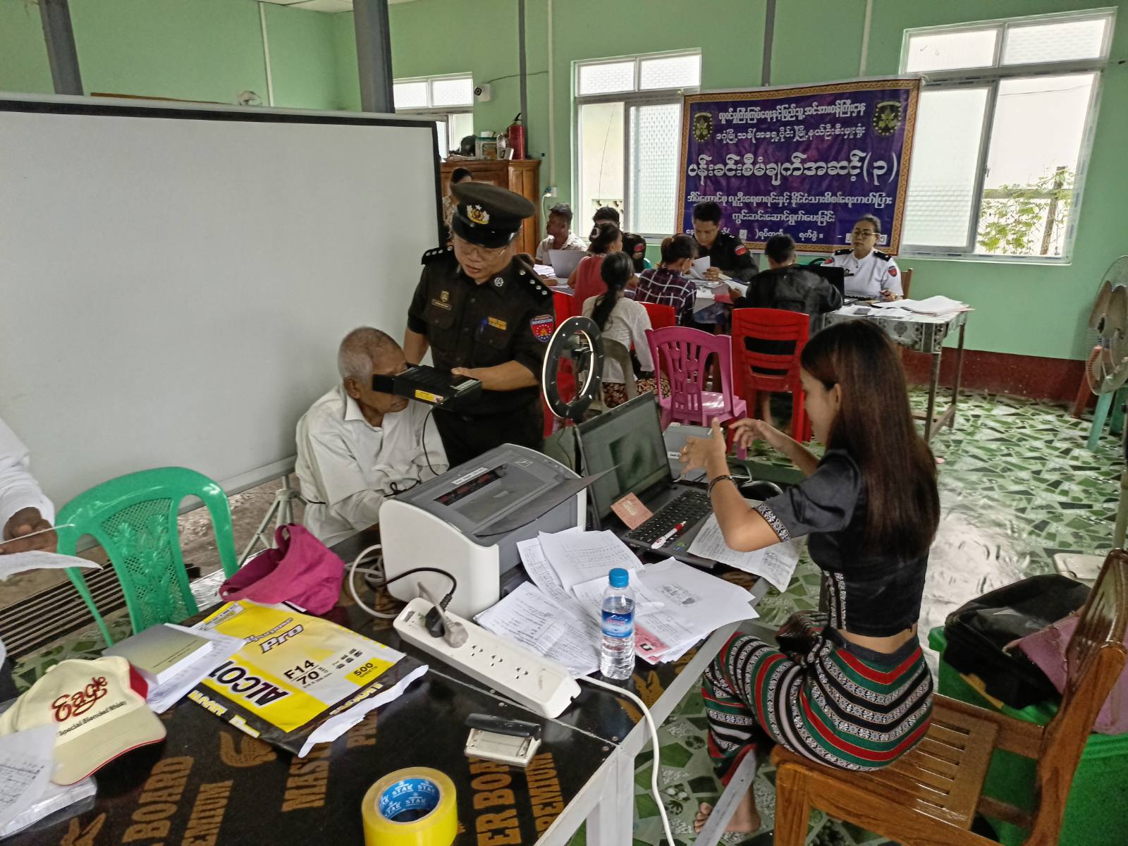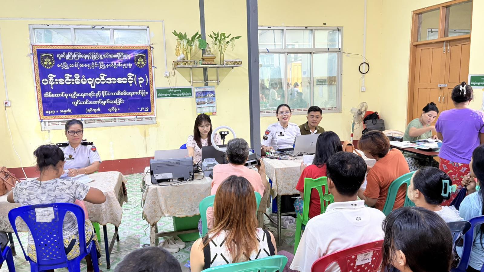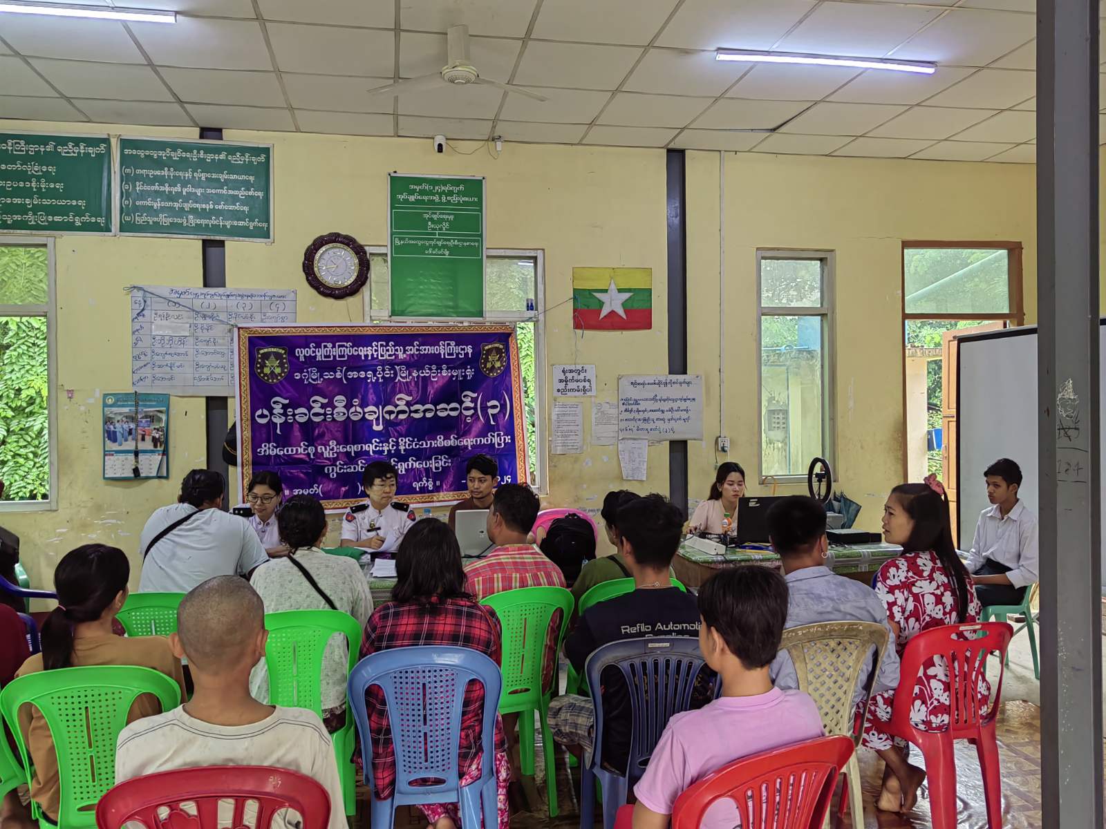 လူဝင်မှုကြီးကြပ်ရေးနှင့်ပြည်သူ့အင်အားဝန်ကြီးဌာန၊ ရန်ကုန်တိုင်းဒေသကြီး၊ ဒဂုံမြို့သစ်(အရှေ့ပိုင်း) မြို့နယ်ဦးစီးမှူးရုံးမှ ဝန်ထမ်းများက ပန်းခင်းစီမံချက်အဆင့်(၃)ဖြင့် အိမ်ထောင်စုလူဦးရေစာရင်း၊ နိုင်ငံသားစိစစ်ရေးကတ်ပြား ထုတ်ပေးခြင်းလုပ်ငန်းများနှင့် Biometric ကောက်ယူခြင်းလုပ်ငန်းများကို မြို့နယ်အတွင်းရှိ ရပ်ကွက်/ ကျေးရွာ အုပ်စုများတွင် ကွင်းဆင်းဆောင်ရွက်ပေးလျက်ရှိပြီး ယနေ့နံနက်ပိုင်းက ရပ်ကွက်/ ကျေးရွာများသို့ မြေပြင်ကွင်းဆင်းဆောင်ရွက်ပေးလျက်ရှိသည်။