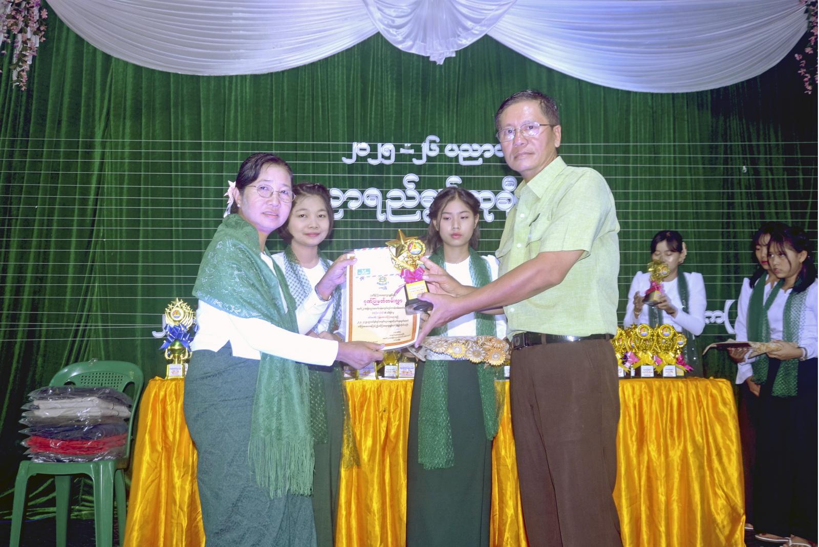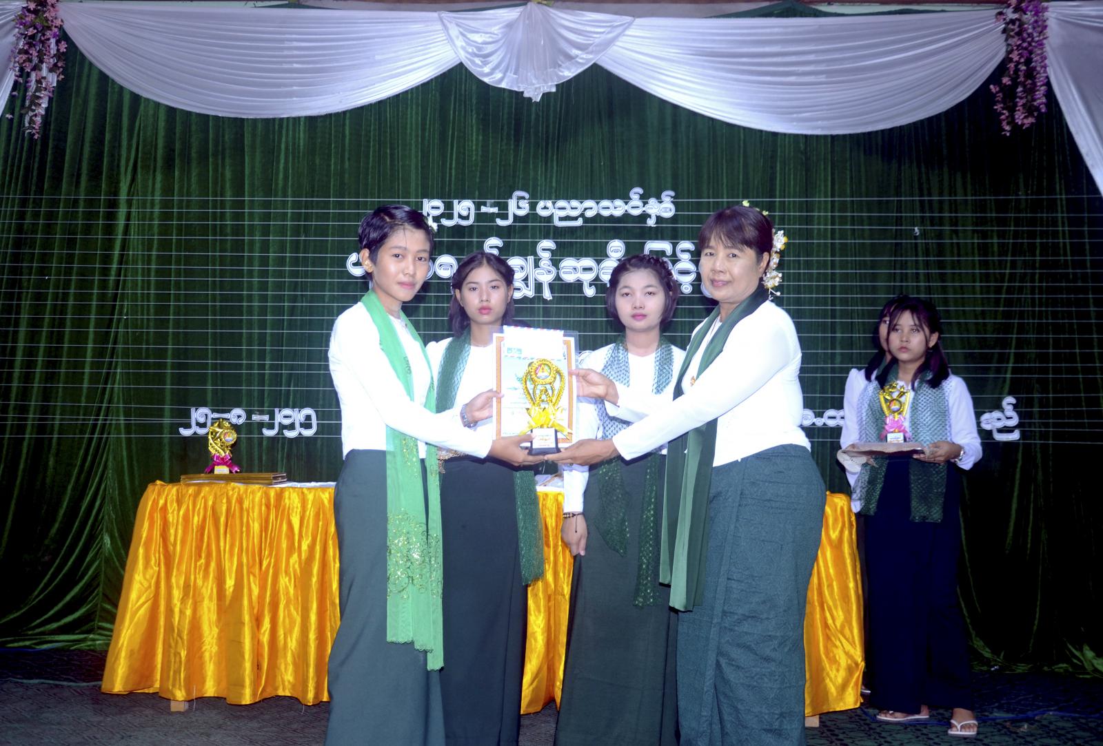 ဦးစွာ Grade-4 နှင့် 5 ကျောင်းသား/သူလေးများက မြန်မာ့ကျောင်း သီချင်းဖြင့်သီဆိုဖျော်ဖြေသည်။ ဆက်လက်၍ မြို့နယ်စီမံခန့်ခွဲရေးနှင့်အုပ်ချုပ်ရေးကော်မတီဥက္ကဋ္ဌ ဦးမျိုးသက်ကျော်က အမှာစကားပြောကြားပြီး မြို့နယ်ပညာရေးမှူးဦးလှထွန်းက ပညာရည်ချွန်ဆုချီးမြှင့်ပေးခြင်းနှင့်ပတ်သက်ပြီး ရှင်းလင်းပြောကြားသည်။ ထို့နောက် ကျောင်းအုပ်ဆရာမကြီးဒေါ်လဲ့လဲ့စိမ်းက ကျေးဇူးတင်စကားပြောကြားသည်။ ယင်းနောက် မြို့နယ်စီမံခန့်ခွဲရေးနှင့် အုပ်ချုပ်ရေးကော်မတီဥက္ကဋ္ဌနှင့်အဖွဲ့ဝင်များ၊ မြို့နယ်ပညာရေးမှူးနှင့်တာဝန်ရှိသူများ၊ ကျောင်းအကျိုးတော်ဆောင်များက အလှုရှင်များအား ဂုဏ်ပြုလွှာများပေးအပ်ပြီး ၊ထူးချွန်ဆုရဆရာမများ၊ ၂၀၂၅ ခုနှစ် တက္ကသိုလ်ဝင်စာမေးပွဲတွင် ဂုဏ်ထူးဖြင့်အောင်မြင်သော ကျောင်းသားကျောင်းသူများနှင့် ၂၀၂၄-၂၀၂၅ ပညာသင်နှစ်တွင် အတန်းအလိုက်ထူးချွန်ဆုရ ကျောင်းသား/ကျောင်းသူများအား ဆု ချီးမြှင့်ကြကြောင်းသိရသည်။