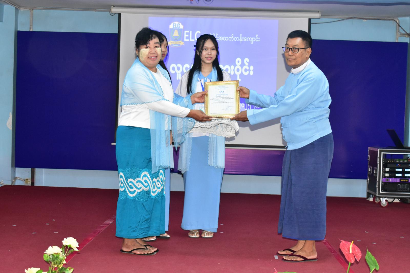 ထို့နောက် ပြန်ကြားရေးနှင့်ပြည်သူ့ဆက်ဆံရေးဦးစီးဌာန လက်ထောက်ညွှန်ကြားရေးမှူးက ELCကိုယ်ပိုင်အထက်တန်းကျောင်း သို့ ဂုဏ်ပြုမှတ်တမ်းလွှာပေးအပ်ရာ ကျောင်းအုပ်ဆရာကြီးက လက်ခံယူပြီး ကျေးဇူးတင်စကားပြောကြားသည်။