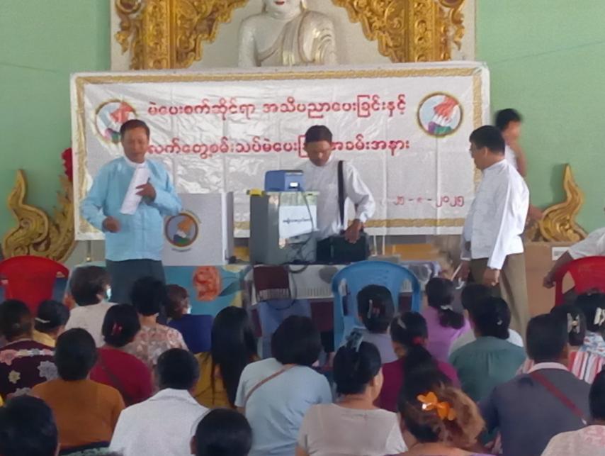 ရှေးဦးစွာ မြို့နယ်ရွေးကောက်ပွဲကော်မရှင်အဖွဲ့ခွဲအတွင်းရေးမှူး ဦးရဲမင်းလွင်က မြန်မာအီလက်ထရောနစ် မဲပေးစက် (MEVM) ၏ လုပ်ဆောင်ချက်များနှင့် ကိုင်တွယ်အသုံးပြုခြင်းနည်းလမ်းများ၊ မြန်မာအီလက်ထရောနစ်မဲပေးစက် (MEVM) ကို အသုံးပြုခြင်းဖြင့် မဲပေးရာတွင် မြန်ဆန်၍ နားလည်လွယ်ခြင်း၊ ပယ်မဲများ မရှိခြင်း၊ အချိန်တိုအတွင်း မဲရလဒ်များ ရေတွက်နိုင်ခြင်း၊ တိကျသော မဲရလဒ်များ ရရှိနိုင်ခြင်း၊ ရေရှည်တွင် ကုန်ကျစရိတ်များလျှော့ချနိုင်ခြင်း၊ ပွင့်လင်းမြင်သာမှုရှိခြင်း၊ ရွေးကောက်ပွဲရလဒ်များကို လျင်မြန်စွာ ကြေညာနိုင်ခြင်းစသည့် အကျိုးကျေးဇူးများ ရရှိနိုင်ကြောင်း ရှင်းလင်းပြောကြားသည်။